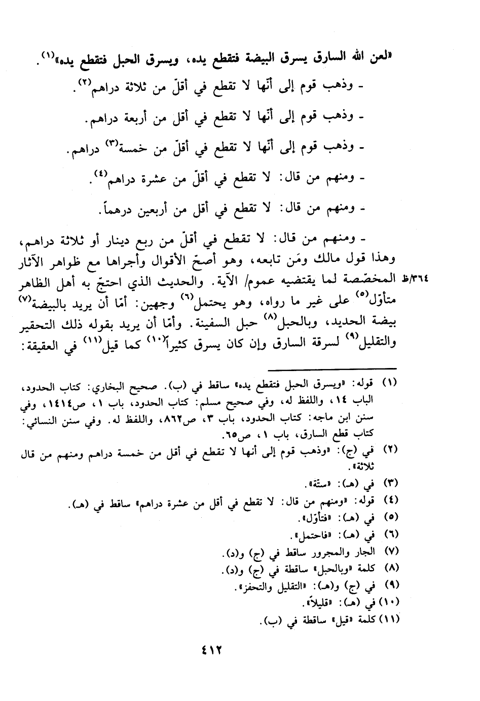 - ومنهم من قال: لا تقطع في أقل من ربع دينار أو ثلاثة دراهم، وهذا قول مالك ومن تابعه، وهو أصح الأقوال وأجراها مع ظواهر الآثار المخصصة لما يقتضيه عموم الآية. والحديث الذي احتج به أهل الظاهر متأول على غير ما رواه، وهو يحتمل وجهين: إما أن يريد بالبيضة بيضة الحديد، وبالحبل حبل السفينة. وإما أن يريد بقوله ذلك التحقير والتقليل لسرقة السارق وإن كان يسرق كثيرًا كما قيل في العقيقة: