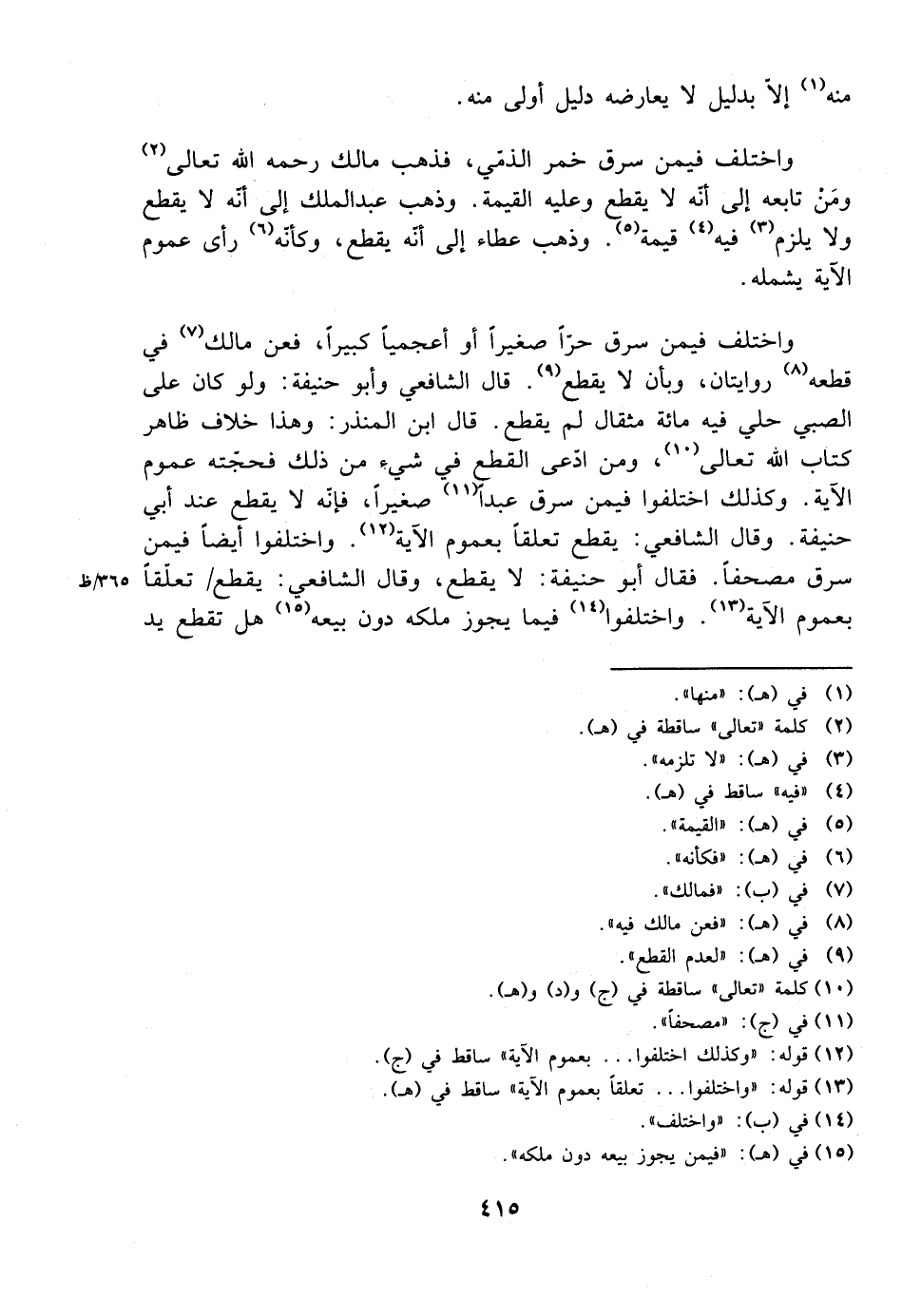 واختلف فيمن سرق خمر الذمي، فذهب مالك رحمه الله تعالى ومن تابعه إلى أنه لا يقطع وعليه القيمة. وذهب عبد المالك إلى أنه لا يقطع ولا يلزم فيه قيمة. وذهب عطاء إلى أنه يقطع، وكأنه رأى عموم الآية يشمله.