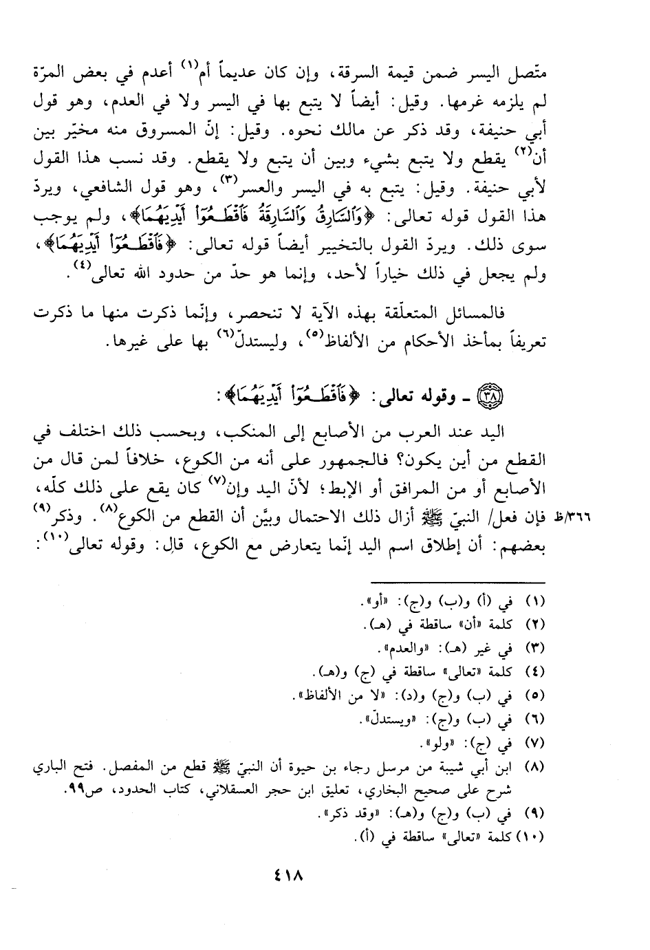 اليد عند العرب من الأصابع إلى المنكب، وبحسب ذلك اختلف في القطع م نأن يكون؟ فالجمهور على أنه من الكوع، خلافًا لمن قال من الأصابع أو من المرافق أو الإبط؛ لأن اليد وإن كان يقع على ذلك كله، فإن فعل النبي صلى الله عليه وسلم أزال ذلك الاحتمال وبين أن القطع من الكوع. وذكر بعضهم: أن إطلاق اسم اليد إنما يتعارض مع الكوع، قال: وقوله تعالى: