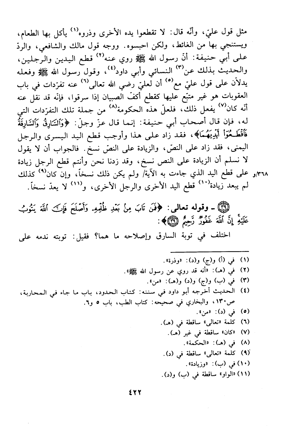 مثل قول علي، وأنه قال: لا تقطعوا يده الأخرى وذروه يأكل بها الطعام، ويستنجي بها من الغائط، ولكن احبسوه. ووجه قول مالك والشافعي، والرد على أبي حنيفة: أن رسول الله صلى الله عليه وسلم روي عنه قطع اليدين والرجلين، والحديث بذلك عن النسائي وأبي داود، وقول رسول الله صلى الله عليه وسلم وفعله يدلان على قول علي مع أن لعلي رضي الله تعالى عنه تفرادت في باب العقوبات هو غير تبع عليها كقطع أكف الصبيان إذا سرقوا، فإنه قد نقل عنه أنه كان يفعل ذلك، فلعل هذه الحكومة من جملة تلك التفردات التي له، فإن قال أصحاب أبي حنيفة: إنما قال الله عز وجل: {والسارق والسارقة فاقطعوا أيديهما}، فقد زاد على هذا وأوجب قطع اليد اليسرى والرجل اليمنى، فقد زاد على النص، والزيادة على النص نسخ. فالجواب أن لا يقول لا نسلم أن الزيادة على النص نسخ، وقد زدنا نحن وأنتم قطع الرجل زيادة على قطع اليد الذي جاءت به الآية ولم يكن ذلك نسخًا، وإن كان كذلك لم يبعد زيادة قطع اليد والرجل الأخرى، ولا يعد نسخًا.