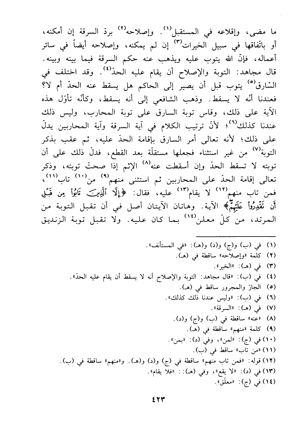 ما مضى، وإقلاعه في المستقبل. وإصلاحه برد السرقة إن أمكنه، أو بإنفاقها في سبيل الخيرات إن لم يمكنه، وإصلاحه أيضًا في سائر أعماله، فإن الله يتوب عليه ويذهب عنه حكم السرقة فيما بينه وبينه. قال مجاهد: التوبة والإصلاح أن يقام عليه الحد. وقد اختلف في السارق يتوب قبل أن يصير إلى الحاكم هل يسقط عنه الحد أم لا؟ فعندنا أنه لا يسقط. وذهب الشافعي إلى أنه يسقط، وكأنه تأول هذه الآية على ذلك، وقاس توبة السارق على توبة المحارب، وليس ذلك عندنا كذلك؛ لأن ترتيب الكلام في آية السرقة وآية المحاربين يدل على ذلك؛ لأنه تعالى أمر السارق بإقامة الحد عليه، ثم عقب بذكر التوبة من غير استثناء فجعلها مستقلة بعد القطع، فدل على أن توبته لا تسقط الحد وإن أسقطت عنه الإثم إذا صحت توبته، وذكر تعالى إقامة الحد على المحاربين ثم استثنى منهم من تاب، فمن تاب منهم لا يقان عليه، فقال: {إلا الذين تابوا من قبل أن تقدروا عليهم} الآية. وهاتان الآيتان أصل في أن تقبل توبة الزنديق
