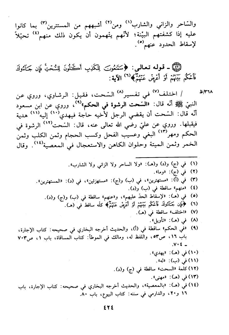 اختلف في تفسير السحت فقيل: الرشاوي، وروي عن النبي صلى الله عليه وسلم أنه قال: ((السحت رشوة في الحكم))، وروي عن ابن مسعود أنه قال: السحت أن يقضي الرجل لأخيه حاجة فيهدي إليه هدية فيقبلها. وروي عن علي رضي الله تعالى عنه، قال: السحت الرشوة في الحكم ومهر البغي وعسيب الفحل وكسب الحجام وثمن الكلب وثمن الخمر وثمن الميتة وحلوان الكاهن والاستعجال في المعصية. وقال