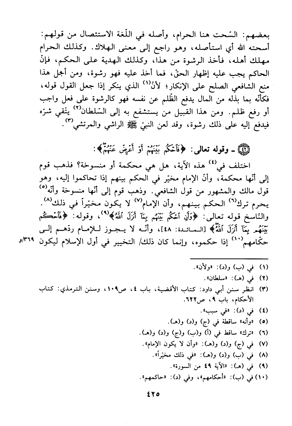 اختلف في هذه الآية، هل هي محكمة أو منسوخة؟ فذهب قوم إلى أنها محكمة، وأن الإمام مخير في الحكم بينهم إذا تحاكموا إليه، وهو قول مالك والمشهور من قول الشافعي. وذهب قوم إلى أنها منسوخة وأنه يحرم ترك الحك بينهم، وأن الإمام لا يكون مخيرًا في ذلك. والناسخ قوله تعالى: {وأن احكم بينهم بما أنزل الله}، وقوله: {فاحكم بينهم بما أنزل الله} [المائدة: 48]، وأنه لا يجوز للإمام ردهم إلى حكامهم إذا حكموه، وإنما كان ذلك التخيير في أول الإسلام ليكون