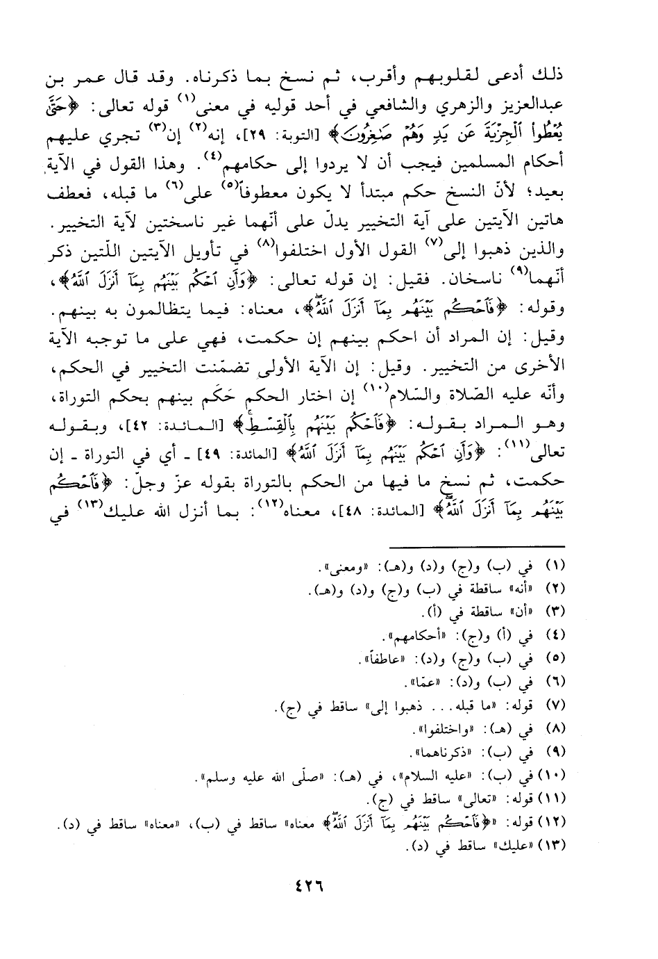 والذين ذهبوا إلى القول الأول اختلفوا في تأويل الآيتين اللتين ذكر أنهما ناسختان. فقيل: إن قوله تعالى: {وأن احكم بينهم بما أنزل الله}، وقوله: {فاحكم بينهم بما أنزل الله}، معناه: فيما يتظالمون به بينهم. وقيلك إن المراد أن احكم بينهم إن حكمت، فهي على ما توجبه الآية الأخرى من التخيير. وقيل: إن الآية الأولى تضمنت التخيير في الحكم، وأنه عليه الصلاة والسلام إن اختار الحكم حكم بينهم بحكم التوراة، وهو المراد بقوله: {فاحكم بينهم بالقسط} [المائدة: 42]، وبقوله تعالى: {وأن احكم بينهم بالقسط} [المائدة: 49]-أي في التوراة- إن حكمت، ثم نسخ ما فيها من الحكم بالتوراة يقوله عز وجل: {فاحكم بينهم بما أنزل الله} [المائدة: 48]، معناه: بما أنزل الله عليك في