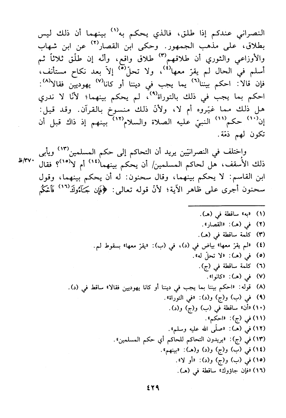النصراني عندكم إذا طلق، فالذي يحكم به بينهما أن ذلك ليس بطلاق، على مذهب الجمهور. وحكى ابن القصار عن ابن شهاب والأوزاعي والثوري أن طلاقهم طلاق واقع، وأنه إن طلق ثلاثًا ثم أسلم في الحال لم يقر معها، ولا تحل إلا بعد نكاح مستأنف، فإن قالا: احكم بيننا بما يجب في ديننا أو كانا يهوديين فقالا: احكم بما يجب في ذلك بالتوراة، لم يحكم بينهما؛ لأنا لا ندري هل ذلك مما غيروه أم لا، ولأن ذلك منسوخ بالقرآن. وقد قيل: إن حكم النبي عليه الصلاة والسلام بينهم إذ ذاك قبل أن تكون لهم ذمة.