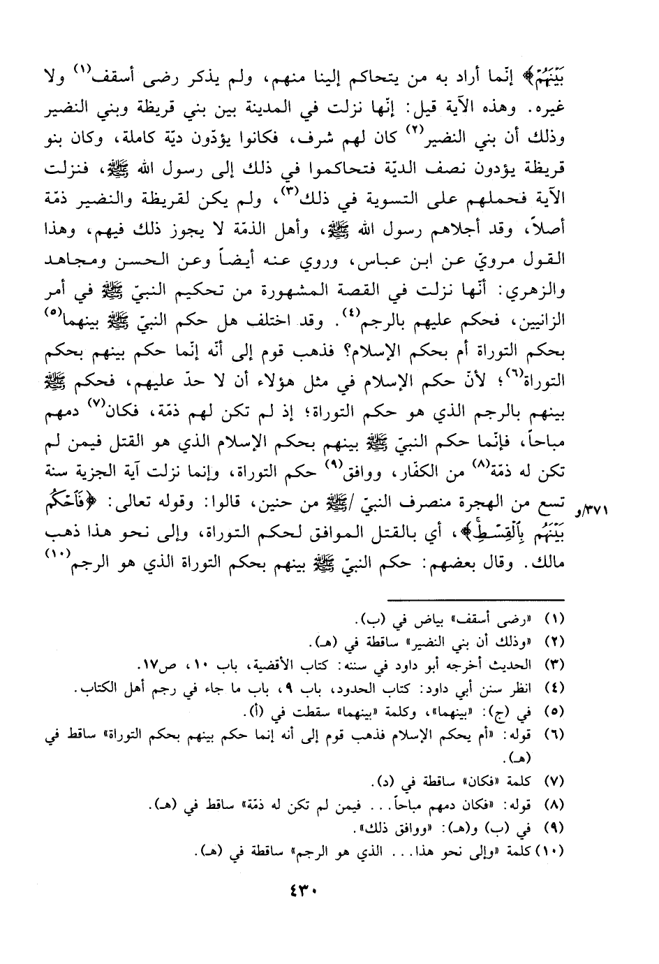 بينهم} إنما أراد به من يتحاكم إلينا منهم، ولم يذكر رضى أسقف ولا غيره. وهذه الآية قيل: إنها نزلت في المدينة بين بني قريظة وبني النضير وذلك أن بني النضير كان لهم شرف، فكانوا يؤدون الدية كاملة، وكان بنو قريظة يؤدون نصف الدية فتحاكموا في ذلك إلى رسول الله صلى الله عليه وسلم، فنزلت الآية فحملهم على التسوية في ذلك، لم يكن لقريظة والنضير ذمة أصلًا، وقد أجلاهم رسول الله صلى الله عليه وسلم، وأهل الذمة لا يجوز ذلك فيهم، وهذا القول مروي عن ابن عباس، وروي عنه أيضًا وعن الحسن ومجاهد والزهري: أنها نزلت في القصة المشهورة من تحكيم النبي صلى الله عليه وسلم في أمر الزانيين، فحكم عليهم بالرجم. وقد اختلف في هل حكم النبي صلى الله عليه وسلم بينهما بحكم التوراة أم بحكم الإسلام؟ فذهب قوم إلى أنه إنما حكم بينهم بحكم التوراة؛ لأن حكم الإسلام في مثل هؤلاء أن لا حد عليهم، فحكم صلى الله عليه وسلم بينهم بالرجم الذي هو حكم التوراة؛ إذ لم تكن لهم ذمة، فكان دمهم مباحًا، فإنما حكم النبي صلى الله عليه وسلم بحكم الإسلام الذي هو القتل فيمن لم تكن له ذمة من الكفار، ووافق حكم التوراة، وإنما نزلت آية الجزية سنة تسع من الهجرة منصرف النبي صلى الله عليه وسلم من حنين، قالوا وقوله تعالى: {فاحكم بينهم بالقسط}، أي بالقتل الموافق لحكم التوراة، وإلى نحو هذا ذهب مالك. وقال بعضهم: حكم النبي صلى الله عليه وسلم بحكم التوراة الذي هو الرجم