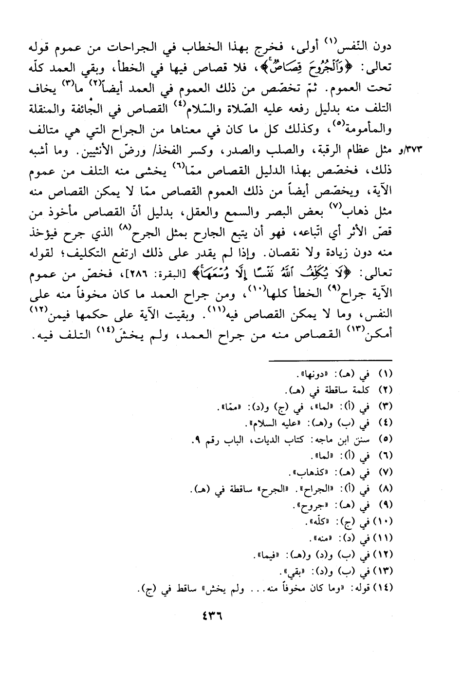 دون النفس أولى، فخرج بهذا الخطاب في الجراحات من عموم قوله تعالى: {والجروح قصاص}، فلا قصاص فيها في الخطأ، وبقي العمد كله تحت العموم. ثم تخصص من ذلك العموم في العمد أيضًا ما يخاف التلف منه بدليل رفعه عليه الصلاة والسلام القصاص في الجائفة والمنقلة والمأمومة، وكذلك كل ما كان في معناها من الجراح التي هي متالف مثل عظام الرقبة، والصلب والصدر، وكسر الفخذ ورض الأنثيين. وما أشبه ذلك، فخصص بهذا الدليل القصاص مما يخشى منه التلف من عموم الآية، ويخصص أيضًا من ذلك العموم القصاص مما لا يمكن القصاص منه مثل ذهاب بعض البصر والسمع والعقل، بدليل أن القصاص مأخوذ من قص الأثر أي اتباعه، قهو أن يتبع الجارح بمثل الجرح الذي جرح فيؤخذ منه دون زيادة ولا نقصان. وإذا لم يقدر على ذلك ارتفع التكليف؛ لقوله تعالى: {لا يكلف الله نفسًا إلا وسعها} [البقرة: 286]، فخص من عموم الآية جراح الخطأ كلها، ومن جراح العمد ما كان مخوفًا منه على النفس، وما لا يمكن القصاص فيه. وبقيت الآية على حكمها فيمن أمكن القصاص منه من جراح العمد، ولم يخش التلف فيه.