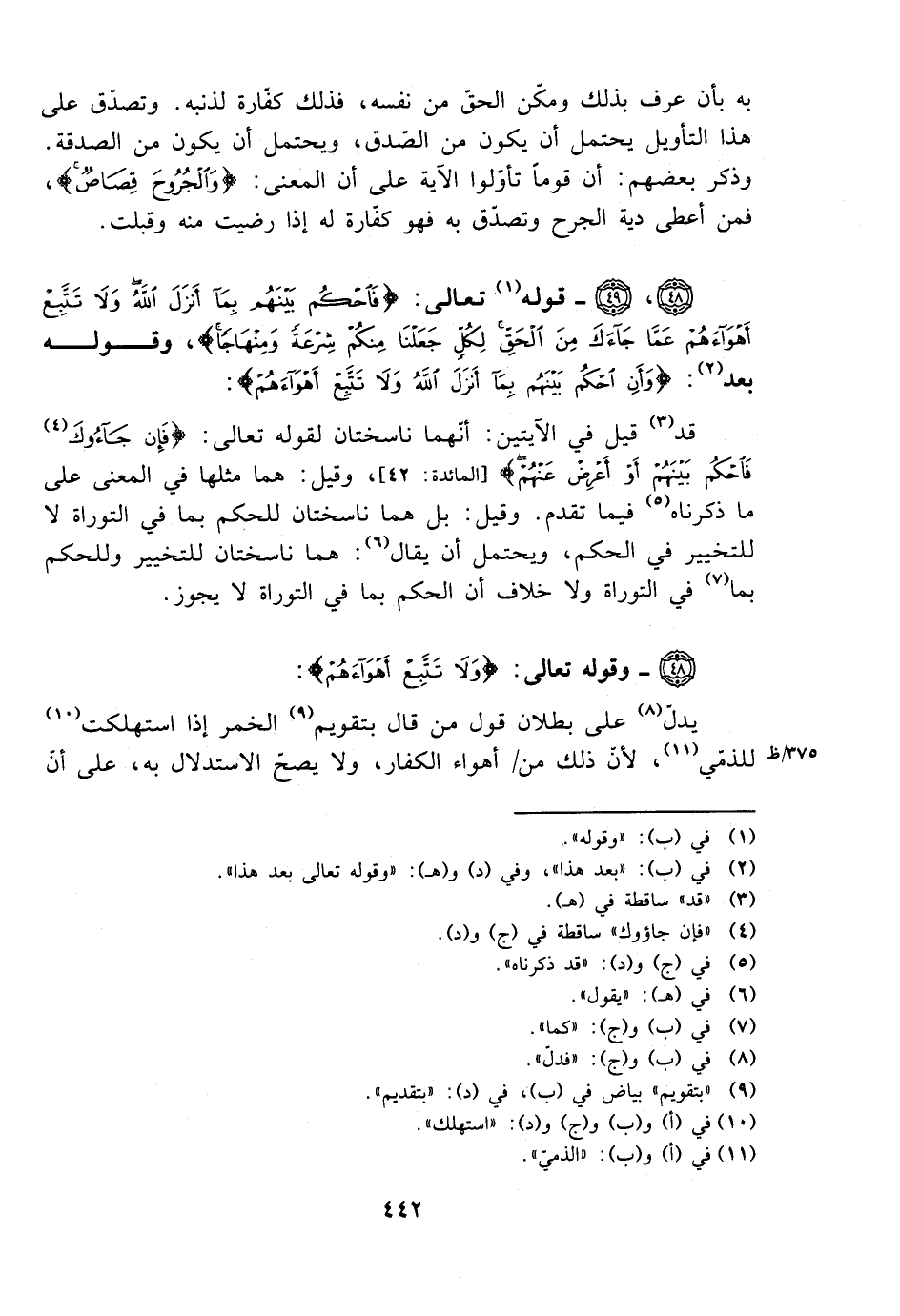 (48)، (49) - قوله تعالى: {فاحكم بينهم بما أنزل الله ولا تتبع أهواءهم عما جاءك من الحق لكل جعلنا منكم شرعة ومنهاجا}، وقوله بعد: {وأن احكم بينهم بما أنزل الله إليك ولا تتبع أهواءهم}: