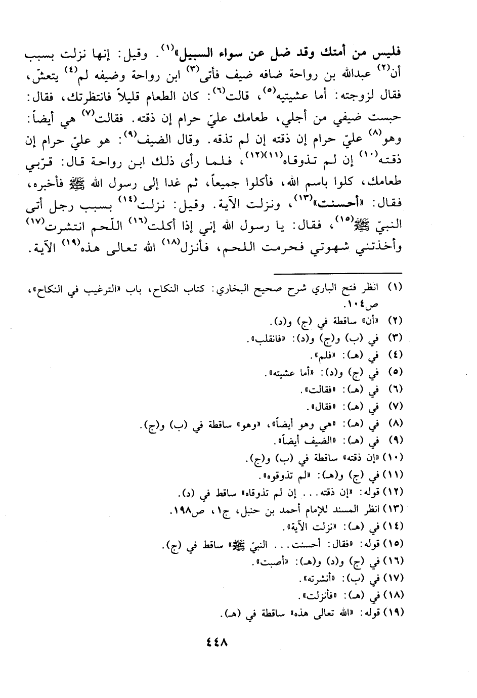 فليس من أمتك وقد ضل عن سواء السبيل)). وقيل: إنها نزلت بسبب أن عبد الله بن رواحة ضافه ضيف فأتى ابن رواحة وضيفه لم يتعش، فقال لزوجته: أما عشيتيه، قالت: كان الطعام قليلًا فانتظرتك، فقال حبست ضيفي من أجلي، طعامك علي حرام إن ذقته. فقالت هي أيضًا: وهو علي حرام إن ذقته إن لم تذقه. وقال الضيف: هو علي حرام إن ذقته إن لم تذوقاه، فلما رأى ذلك ابن رواحة قال: قربي طعامك، كلوا باسم الله، فأكلوا جميعًا، ثم غدا إلى رسول الله صلى الله عليه وسلم فأخبره، فقال: ((أحسنت))، ونزلت الآية. وقيل: نزلت بسبب رجل أتى النبي صلى الله عليه وسلم، فقال: يا رسول الله إني إذا أكلت اللحم انتشرت وأخذتني شهوتي فحرمت اللحم، فأنزل الله تعالى هذه الآية.