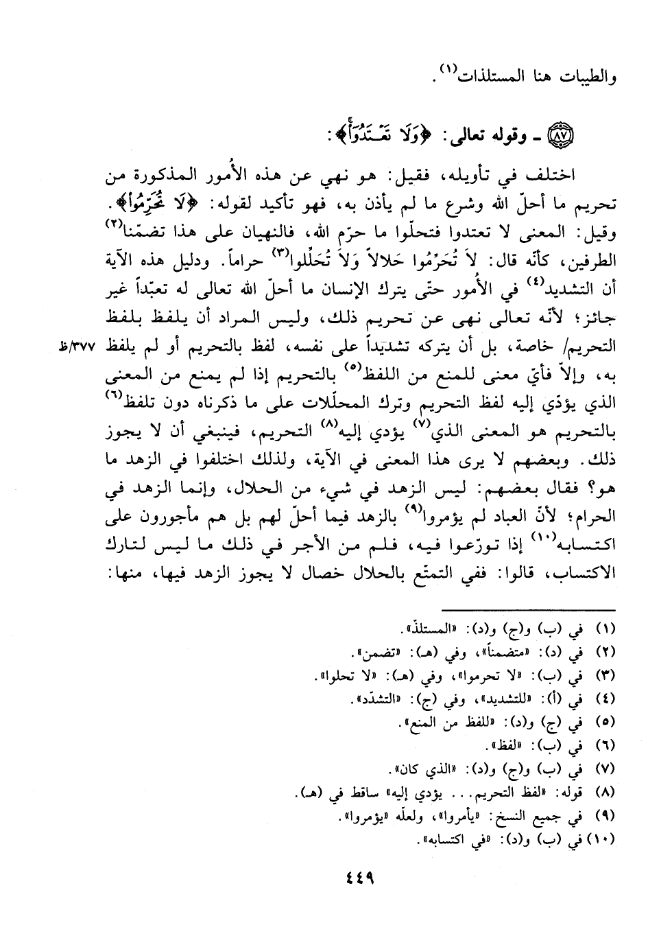 اختلف في تأويله، فقيل: هو نهي عن هذه الأمور المذكورة من تحريم ما أحل الله وشرع ما لم يأذن به، فهو تأكيد لقوله: {لا تحرموا}. وقيل: المعنى لا تعتدوا فتحلوا ما حرم الله، فالنهيان على هذا تضمنا الطرفين، كأنه قال: لا تحرموا حلالًا ولا تحللوا حرامًا. ودليل هذه الآية أن التشديد في الأمو حتى يترك الإنسان ما أحل الله تعالى له تعبدًا غير جائز؛ لأنه تعالى نهى عن تحريم ذلك، وليس المراد أن يلفظ بلفظ التحريم خاصة، بل أن يتركه تشديدًا على نفسه، لفظ بالتحريم أو لم يلفظ به، وإلا فأي معنى للمنع من اللفظ بالتحريم إذا لم يمنع من المعنى الذي يؤدي إليه لفظ التحريم وترك المحللات على ما ذكرناه دون تلفظ بالتحريم هو المعنى الذي يؤدي إليه التحريم، فينبغي أن لا يجوز ذلك. وبعضهم لا يرى هذا المعنى الذي في الآية، ولذلك اختلفوا في الزهد ما هو؟ فقال بعضهم: ليس الزهد في شيء من الحلال، وإنما الزهد في الحرام؛ لأن العباد لم يؤمروا بالزهد فيما أحل لهم بل هم مأجورون على اكتسابه إذا تورعوا فيه، فلم من الأجر في ذلك ما ليس لتارك الاكتساب، فالوا: ففي التمتع بالحلال خصال لا يجوز الزهد فيها، منها: