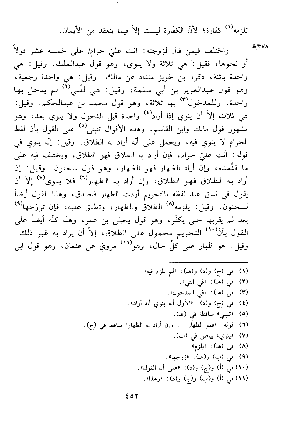 واختلف فيمن قال لزوجته: أنت علي حرام على خمسة عشر قولًا أو نحوها، فقيل: هي ثلاثة ولا ينوي، وهو قول عبد الملك. وقيل: هي واحدة بائنة، ذكره ابن خويز منداد عن مالك. وقيل: هي واحدة رجعية، وهو قول عبد العزيز ابن أبي سلمة، وقيل: هي للتي لم يدخل بها واحدة، وللمدخول بها ثلاثة، وهو قول محمد بن عبد الحكم. وقيل: هي ثلاث إلا أن ينوي إذا أراد واحدة قبل الدخول ولا ينوي بعد، وهو مشهور قول مالك وابن القاسم، وهذه الأقوال تنبني على القول بأن لفظ الحرام لا ينوي فيه، ويحمل على أنه أراد به الطلاق. وقيل: إنه ينوي في قوله: أنت علي حرام، فإن أراد به الطلاق فهو الطلاق، ويختلف فيه على ما قدمناه، وإن أراد الظهار فهو الظهار، وهو قول سحنون. وقيل: إن أراد به الطلاق فهو الطلاق، وإن أراد به الظهار فلا ينوي إلا أن يقول في نسق عند لفظه بالتحريم أردت الظهار فيصدق، وهذا القول أيضًا لسحنون. وقيل: يلزمه الطلاق والظهار، وتطلق عليه، فإن تزوجها بعد لم يقربها حتى يكفر، وهو قول يحيى بن عمر، وهذا كله أيضًا على القول بأن التحريم محمول على الطلاق، إلا أن يراد به غير ذلك. وقيل: هو ظهار على كل حال، وهو مروي عن عثمان، وهو قول ابن
