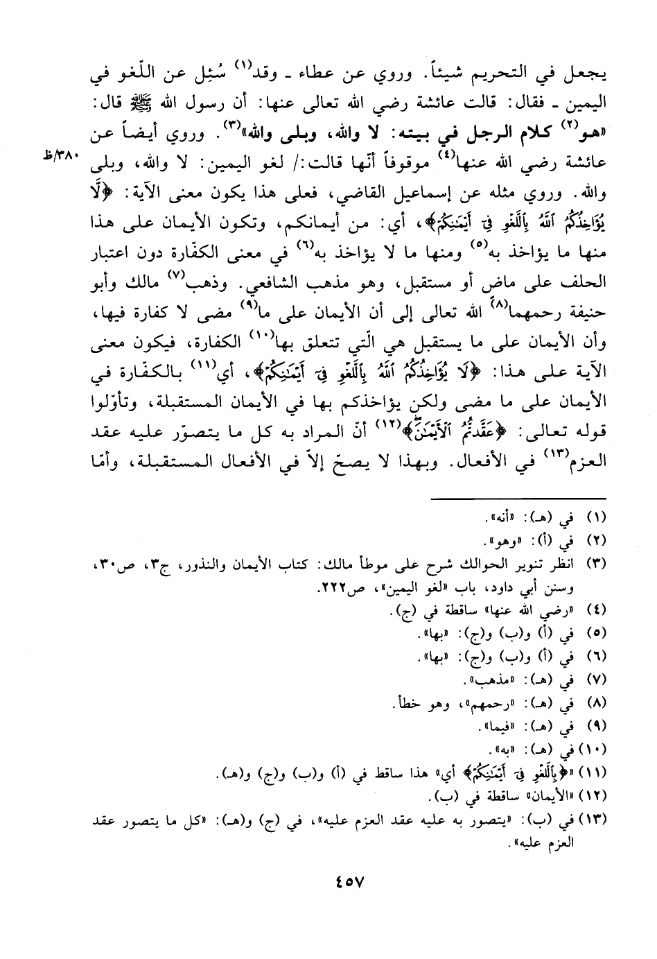 يجعل في التحريم شيئًا. وروي عن عطاء -وقد سئل عن اللغو في اليمين- فقال: قالت عائشة رضي الله تعالى عنها: أن رسول الله صلى الله عليه وسلم قال: ((هو كلام الرجل في بيته: لا والله، بلى والله)). وروي أيضًا عن عائشة رضي الله عنها موقوفًا أنها قالت: لغو اليمين: لا والله، بلى والله. وروي مثله عن إسماعيل القاضي، فعلى هذا يكون معنى الآية: {لا يؤاخذكم الله باللغو في أيمانكم}، أي: من أيمانكم، وتكون الأيمان على هذا منها ما يؤاخذ به ومنها ما لا يؤاخذ به في معنى الكفارة دون اعتبار الحلف على ماض أو مستقبل، وهو مذهب الشافعي. وذهب مالك وأبو حنيفة رحمهما الله تعالى إلى أن الأيمان على ما مضى لا كفارة فيها، وأن الأيمان على ما يستقبل هي التي تتعلق بها الكفارة، فيكون معنى الآية على هذا: {لا يؤاخذكم الله باللغو في أيمانكم}، أي بالكفارة في الأيمان على ما مضى ولكن يؤاخذكم بها في الأيمان المستقبلة، وتأولوا قوله تعالى: {عقدتم الأيمان} أن المراد به كل ما يتصور عليه عقد العزم في الأفعال. وبهذا لا يصح إلا في الأفعال المستقبلة، وأما