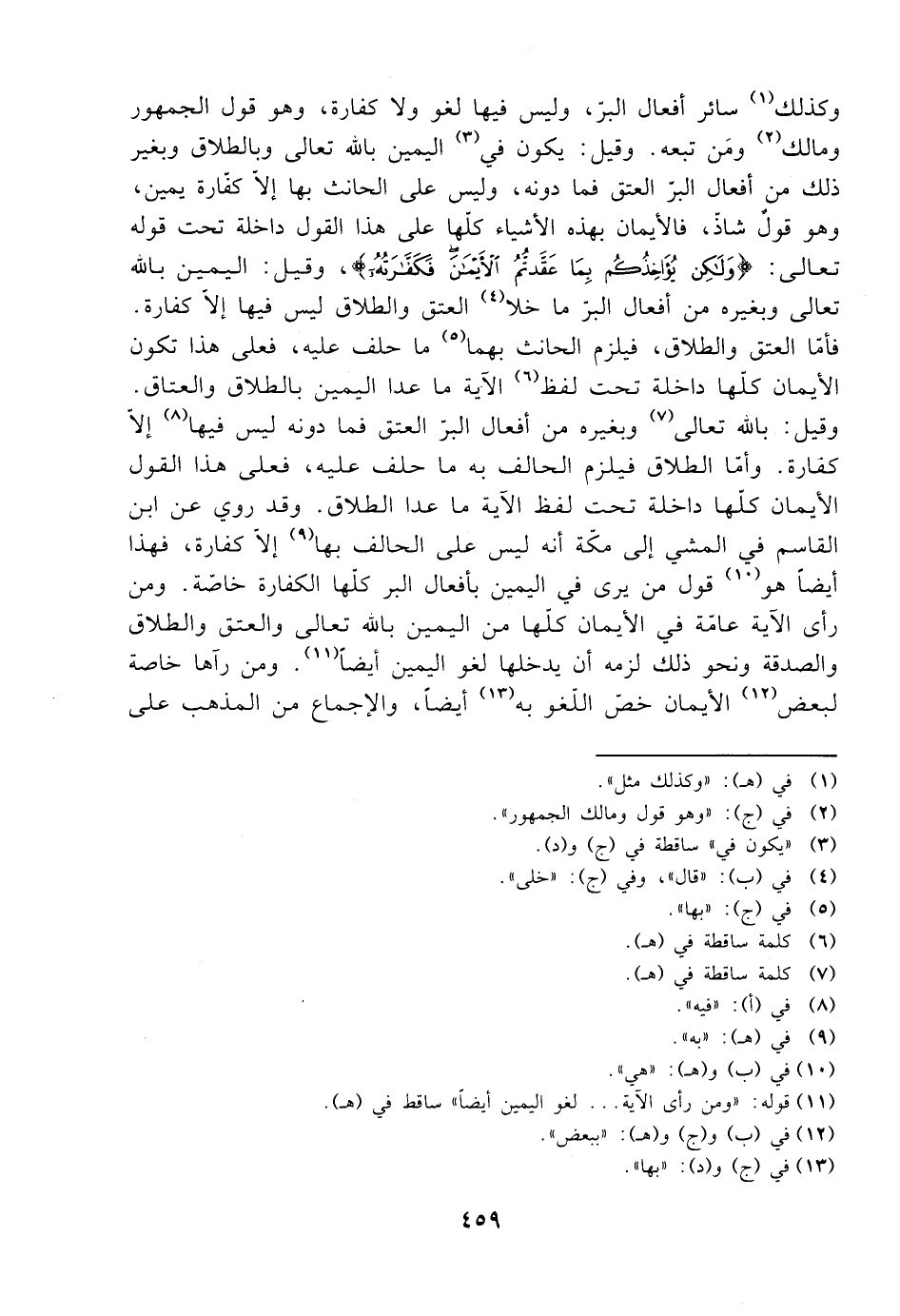 وكذلك سائر أفعال البر، وليس فيها لغو ولا كفارة، وهو قول الجمهور ومالك ومن تبعه. وقيل: يكون في اليمين بالله تعالى وبالطلاق وبغير ذلك من أفعال البر العتق فما دونه، وليس على الحانث بها إلا كفارة يمين، وهو قول شاذ، فالأيمان بهذه الأشياء كلها على هذا القول داخلة تحت قوله تعالى: {ولكن يؤاخذكم بما عقدتم الأيمان فكفارته}، وقيل: اليمين بالله تعالى وبغيره من أفعال البر ما خلا العتق والطلاق ليس فيها إلا كفارة. فأما العتق والطلاق فيلزم الحانث بهما ما حلف عليه، فعلى هذا تكون الأيمان كلها داخلة تحت لفظ الآية ما عدا اليمين بالطلاق والعتاق. وقيل: بالله تعالى وبغير من أفعال البر العتق فمنا دونه ليس فيها إلا كفارة. وأما الطلاق فيلزم الحلاف به ما حلف عليه، فعلى هذا القول الأيمان كلها داخلة تحت لفظ الآية ما عدا الطلاق. وقد روي عن ابن القاسم في المشي إلى مكة أنه ليس على الحالف بها إلا كفارة، فهذا أيضًا هو قول من يرى في اليمين بالله تعالى والعتق والطلاق والصدقة ونحو ذلك لزمه أن يدخلها لغو اليمين أيضًا. ومن رآها خاصة لبعض الأيمان خص اللغو به أيضًا، والإجماع من المذهب على