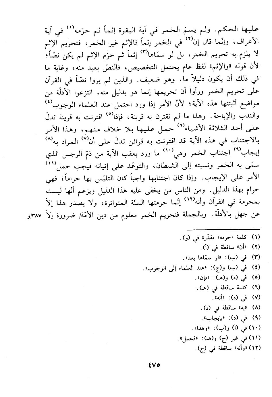 عليها الحكم. ولم يسم الخمر في آية البقرة إثمًا ثم حرمه في آية الأعراف، إنما قال إن الخمر إثمًا فالإثم غير الخمر، فتحريم الإثم لا يلزم به تحريم الخمر، بل لو سماها إثمًا ثم حرم الإثم لم يكن نصًا؛ لأن قوله ((والإثم)) لفظ عام يحتمل التخصيص، فالنص بعيد منه، غاية ما في ذلك أن يكون دليلًا ما، وهو ضعيف. والذين لم يروا نصًا في القرآن على تحريم الخمر ورأوا أن تحريمها إنما هو بدليل منه، انتزعوا الأدلة من مواضع أثبتتها هذه الآية؛ لأن الأمر إذا ورد احتمل عند العلماء الوجوب والندب والإباحة. وهذا ما لم تقترن به قرينة، فإذا اقترنت به قرينة تدل على أحد الثلاثة الأشياء حمل عليها بلا خلاف منهم، وهذا الأمر بالاجتناب في هذه الآية قد اقترنت به قرائن تدل على أن المراد به إيجاب اجتناب الخمر وهي ما ورد بعقب الآية من ذم الرجس الذي سمي به الخمر ونسبته إلى الشيطان، والتوعد على إتيانه فيجب حمل الأمر على الإيجاب. وإذا كان اجتنابها واجبًا كان التلبس بها حرامًا، فخي حرام بهذا الدليل. ومن الناس من يخفى عليه هذا الدليل ويزعم أنها ليس بمحرمة في القرآن وأنه إنما حرمتها السنة المتواترة، ولا يصدر هذا إلا عن جهل بالأدلة. وبالجملة فتحريم الخمر معلوم من دين الأمة ضرورة إلا