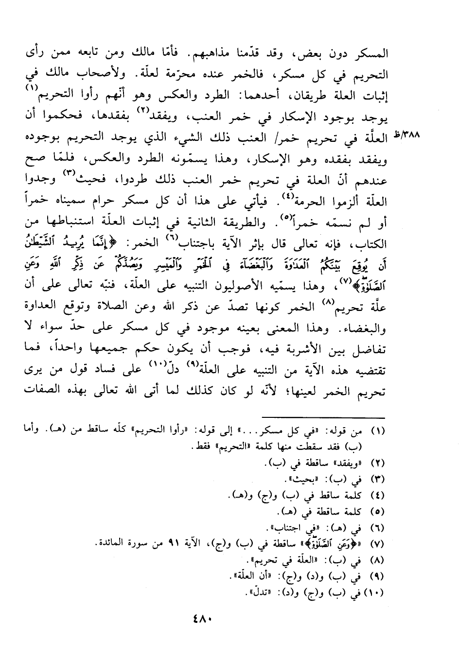 المسكر دون بعض، وقد قدمنا مذاهبهم. فأما مالك ومن تابعه ممن رأى التحريم في كل مسكر، فالخمر عنده محرمة لعلة. ولأصحاب مالك في إثبات العلة طريقان، أحدهما: الطرد والعكس وهو أنهم رأوا التحريم يوجد بوجود الإسكار في خمر العنب، ويفقد بفقدها، فحكموا أن العلة في تحريم خمر العنب ذلك الشيء الذي يوجد التحريم بوجوده ويفقد بفقده وهو الإسكار، وهذا يسمونه الطرد والعكس، فلما صح عندهم أن العلة في تحريم خمر العنب ذلك طردوا، فحيث وجدوا العلة ألزموا الحرمة. فيأتي على هذا أن كل مسكر حرام سميناه خمرًا أو لم نسمه خمرًا. والطريقة الثانية في إثبات العلة استنباطها من الكتاب، فإنه تعالى قال بإثر الآية باجتناب الخمر: {إنما يريد الشيطان أن يوقع بينكم العداوة والبغضاء في الخمر والميسر ويصدكم عن ذكر الله وعن الصلاة}، وهذا يسميه الأصوليون التنبيه على العلة، فنبه تعالى على أن علة تحريم الخمر كونها تصد عن ذكر الله وعن الصلاة وتوقع العداوة والبغضاء. وهذا المعنى بعينه موجود في كل مسكر على حد سواء لا تفاضل بين الأشربة فيه، فوجب أن يكون حكم جميعها واحدًا، فما تقتضيه هذه الآية من التنبيه على العلة دل على فساد قول من يرى تحريم الخمر لعينها؛ لأنه لو كان كذلك لما أتى الله تعالى بهذه الصفات