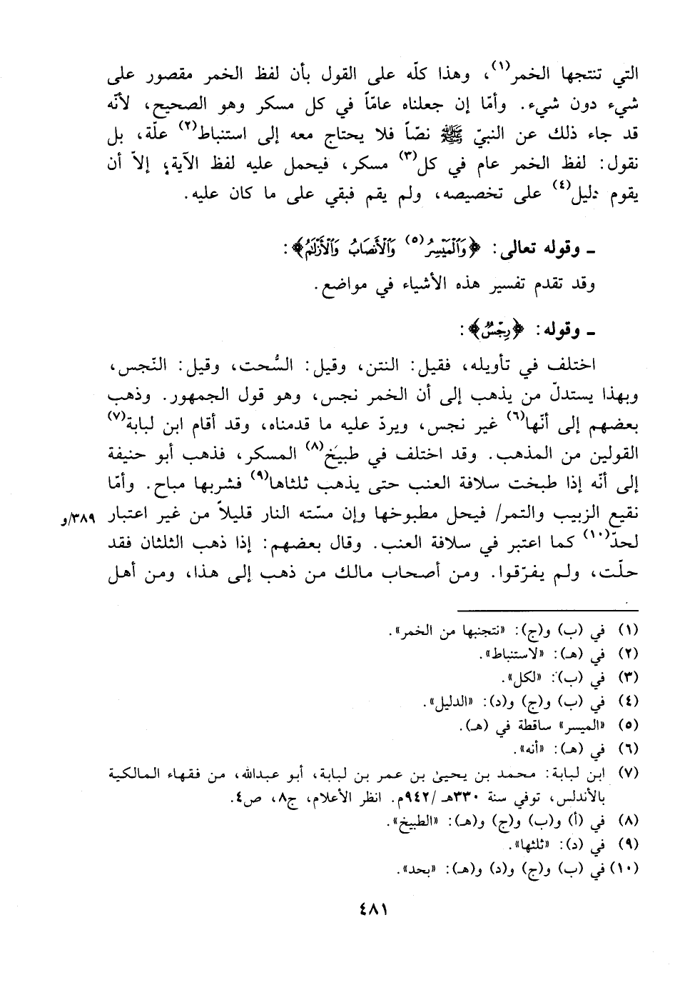 اختلف في تأويله، فقيل: النتن، وقيل: السحت، وقيل: النجس، وبهذا يستدل من يذهب إلى أن الخمر نجس، وهو قول الجمهور. وذهب بعضهم إلى أنها غير نجس، ويرد عليه ما قدمناه، وقد أقام ابن لبابة القولين من المذهب. وقد اختلف في طبيخ المسكر، فذهب أبو حنيفة إلى أنه إذا طبخت سلافة العنب حتى يذهب ثلثاها فشربها مباح. وأما نقيع الزبيب والتمر فيحل مطبوخها وإن مسته النار قليلًا من غير اعتبار لحد كام اعتبر في سلافة العنب. وقال بعضهم: إذا ذهب الثلثان فقد حلت، ولم يفرقوا. ومن أصحاب مالك من ذهب إلى هذا، ومن أهل