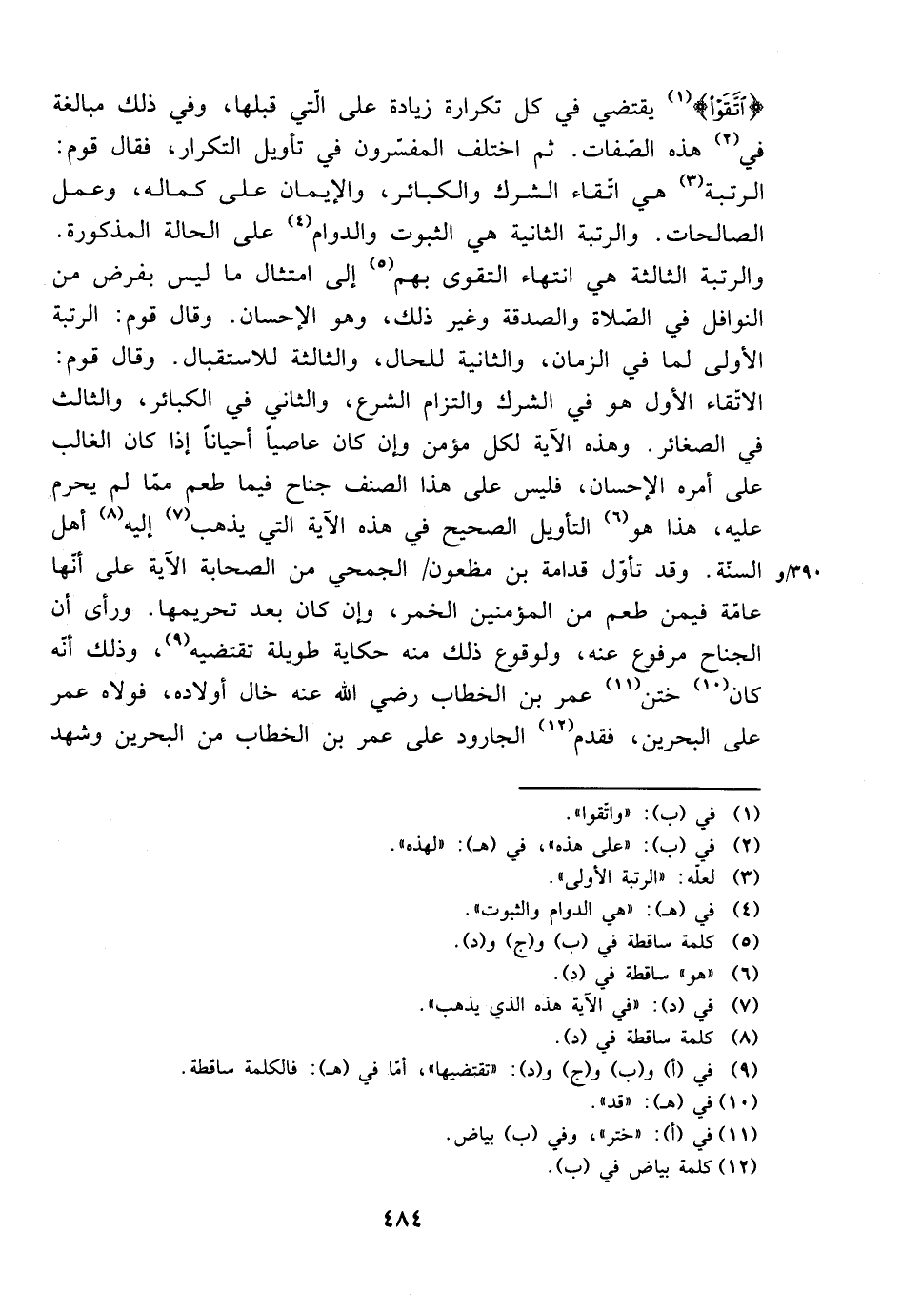 {واتقوا} يقتضي في كل تكرارة زيادة على التي قبلها، وفي ذلك مبالغة في هذه الصفات. ثم اختلف المفسرون في تأويل التكرار، فقال قوم: الرتبة هي اتقاء الشرك والكبائر، والإيمان على كماله، وعمل الصالحات. الرتبة الثانية هي الثبوت والدوام على الحالة المذكورة. والرتبة الثالثة هي انتهاء التقوى بهم إلى امتثال ما ليس بفرض من النوافل في الصلاة والصدقة وغير ذلك، وهو الإحسان. وقال قوم: الرتبة الأولى لما في الزمان، والثانية للحال، والثالثة للاستقبال. وقال قوم: الاتقاء الأول هو في الشرك والتزام الشرع، والثاني في الكبائر، والثالث في الصغائر. وهذه الآية لكل مؤمن وإن كان عاصيًا أحيانًا إذا كان الغالب على أمره الإحسان، فليس على هذا الصنف جناح فيما طعم مما لم يحرم عليه، هذا هو التأويل الصحيح في هذه الآية الذي يذهب إليه أهل السنة. وقد تأول قدامة ابن مظعون الجمحي من الصحابة الآية على أنها عامة فيمن طعم من المؤمنين الخمر، وإن كان بعد تحريمها. ورأى أن الجناح مرفوع عنه، لوقوع ذلك منه حكاية طويلة تقتضيه، وذلك أنه كان ختن عمر بن الخطاب رضي الله عنه حال أولاده، فولاه عمر على البحرين، فقدم الجارود على عمر بن الخطاب من البحرين وشهد
