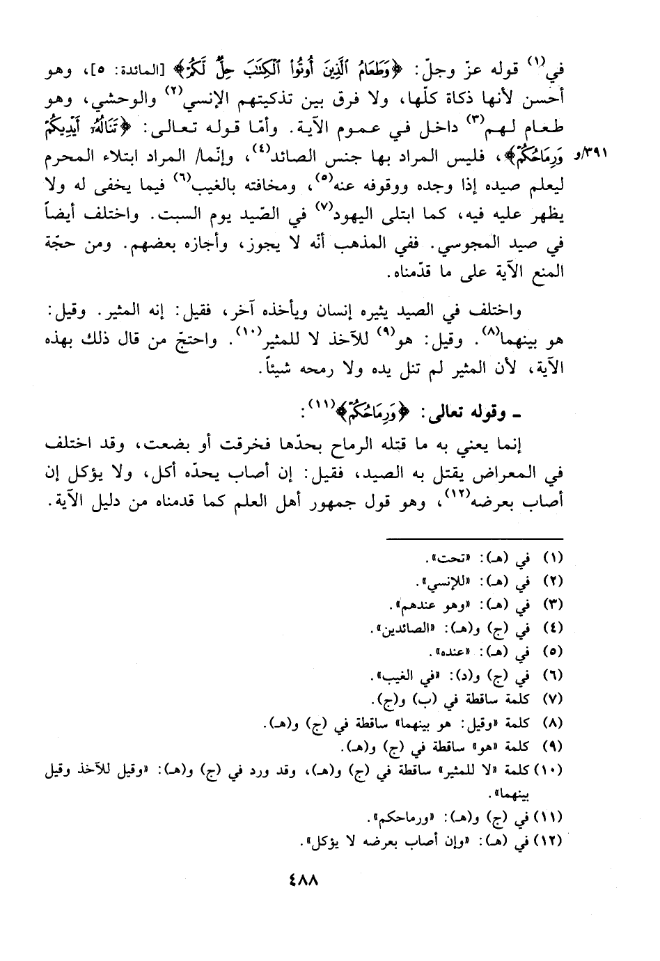 في قوله عز وجل: {وطعام الذين أوتوا الكتاب حل لكم} [المائدة: 5]، وهو أحسن لأنها ذكاة كلها، ولا فرق بين تذكيتهم الإنسي والوحشي، وهو طعام لهم داخل في عموم الآية. وأما قوله تعالى: {تناله أيديكم ورماحكم}، فليس المراد بها جنس الصائد، وإنما المراد ابتلاء المحرم ليعلم صيده إذا وجده ووقوفه عنه، ومخافته بالغيب فيما يخفى له ولا يظهر عليه فيه، كما ابتلى اليهود في الصيد يوم السبت. واختلف أيضًا في صيد المجوسي. ففي المذهب أنه لا يجوز، وأجازه بعضهم. ومن حجة المنع الآية على ما قدمناه.