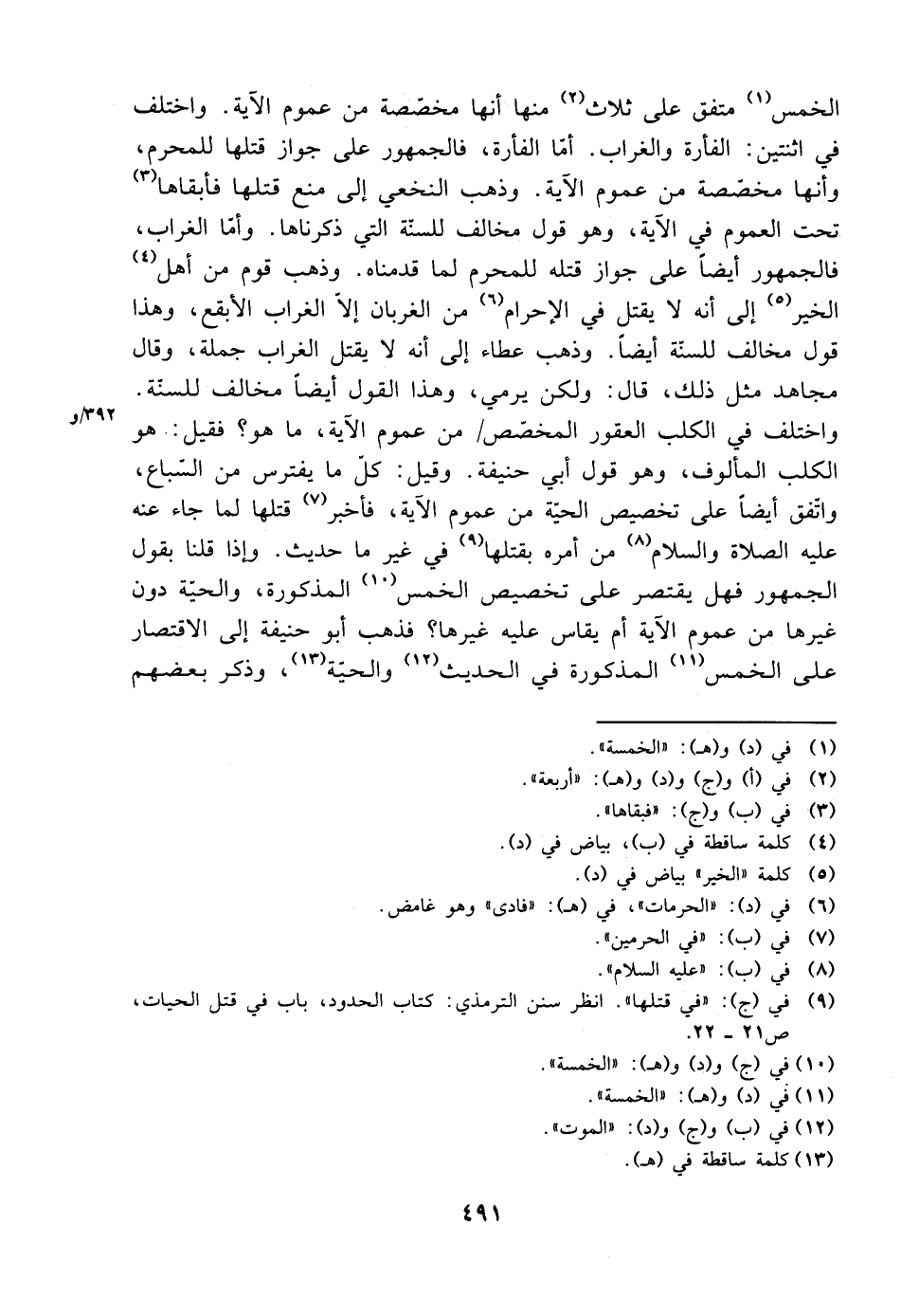 الخمس متفق على ثلاث منها أنها مخصصة من عموم الآية. واختلف في اثنتين: الفأرة والغراب. أما الفأرة، فالجمهور على جواز قتلها للمحرم، وأنها مخصصة من عموم الآية. وذهب النخعي إلى منع قتلها فأبقاها تحت العموم في الآية، وهو قول مخالف للسنة التي ذكرناها. وأما الغراب، فالجمهور أيضًا على جواز قتله للمحرم لما قدمناه. وذهب قوم من أهل الخير إلى أنه لا يقتل في الإحرام من الغربان إلا الغراب الأبقع، وهذا قول مخالف للسنة أيضًا. وذهب عطاء إلى أنه لا يقتل الغراب جملة، وقال مجاهد مثل ذلك، قال: ولكن يرمي، وهذا القول أيضًا مخالف للسنة. واختلف في الكلب العقور المخصص من عموم الآية، وما هو؟ فقيل: هو الكلب المألوف، وهو قول أبي حنيفة. وقيل: كل ما يفترس من السباع، واتفق أيضًا على تخصيص الحية من عموم الآية، فأخبر قتلها لما جاء عنه عليه الصلاة والسلام من أمره بقتلها في غير ما حديث. وإذا قلنا بقول الجمهور فهل يقتصر على تخصيص الخمس المذكورة، والحية دون غيرها من عموم الآية أم يقاس عليه غيرها؟ فذهب أبو حنيفة إلى الاقتصار على الخمس المذكورة في الحديث والحية، وذكر بعضهم