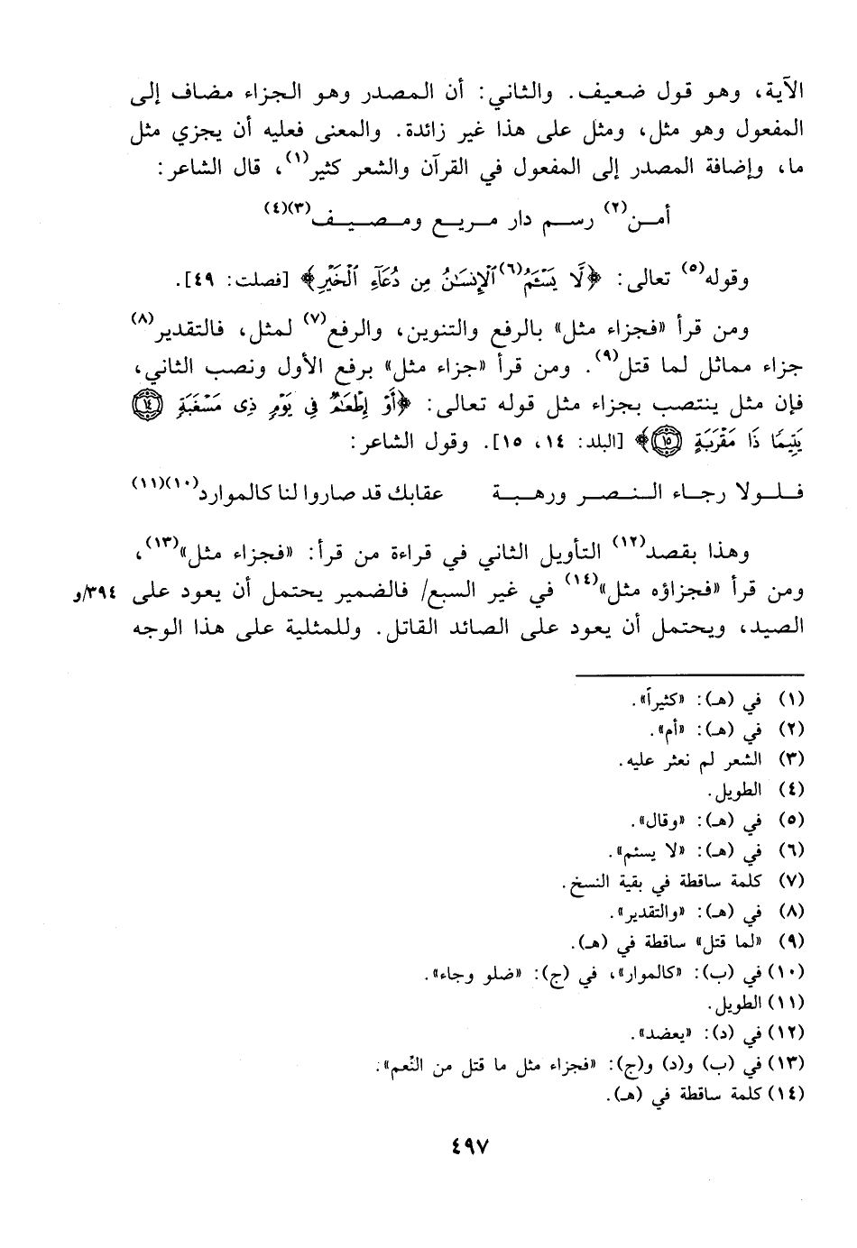 وهذا بقصد التأويل الثاني في قراءة من قرأ: ((فجزاء مثل))، ومن قرأ ((فجزاؤه مثل)) في غير السبع فالضمير يحتمل أن يعود على الصيد، يحتمل أن يعود الصائد القاتل. وللمثلية على هذا الوجه