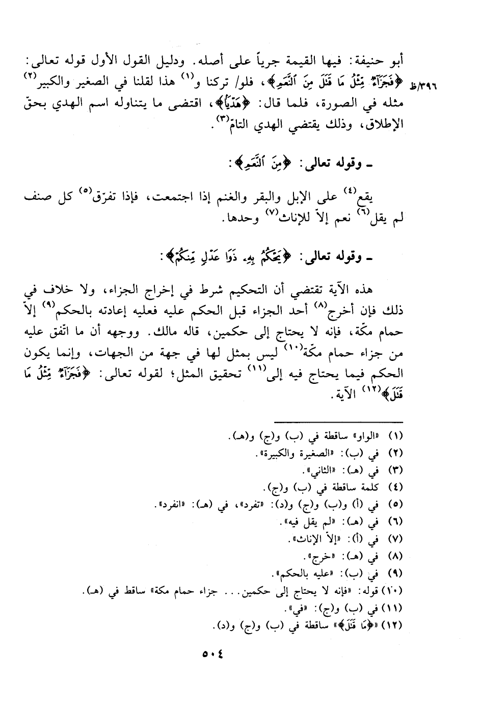 أبو حنيفة: فيها القيمة جريًا على أصله. ودليل القول الأول قوله تعالى: {فجزاء مثل ما قتل من النعم}، فلو تركنا وهذا لقلنا في الصغير والكبير مثله في الصورة، فلما قال: {هديًا}، اقتضى ما يتناوله اسم الهدي بحق الإطلاق، ذلك يقتضي الهدي التام.