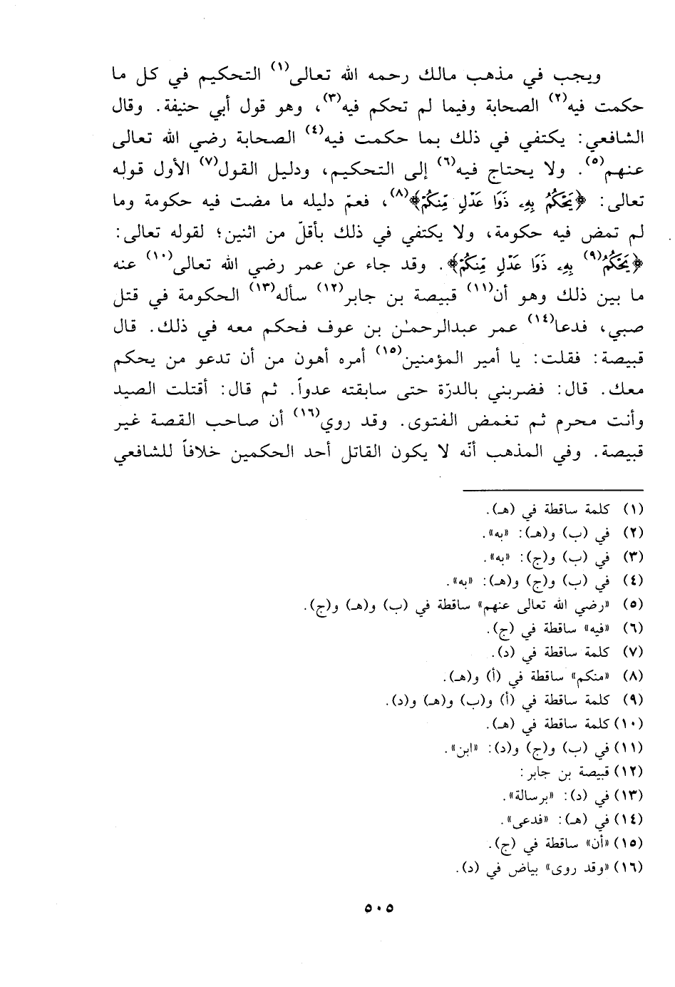 ويجب في مذهب مالك رحمه الله تعالى التحكيم في كل ما حكمت فيه الصحابة وفيما لم تحكم فيه، وهو قول أبي حنيفة. وقال الشافعي: يكتفي في ذلك بما حكمت فيه الصحابة رضي الله تعالى عنهم. ولا يحتاج فيه إلى التحكيم، ودليل القول الأول قوله تعالى: {يحكم به ذوا عدل منكم}، فعم دليله ما مضت فيه حكومة وما لم تمض فيه حكومة، ولا يكتفي في ذلك بأقل من اثنين؛ لقوله تعالى: {يحكم به ذوا عدل منكم}. وقد جاء عن عمر رضي الله تعالى عنه ما بين ذلك وهو أن قبيصة بن جابر سأله الحكومة في قتل صبي، فدعا عمر عبد الرحمن بن عوف فحكم معه في ذلك. قال قبيصة: فقلت: يا أمير المؤمنين أمره أهون من أن تدعو من يحكم معك. قال: فضربني بالدرة حتى سابقته عدوًا. ثم قال: أقتلت الصيد وأنت محرم ثم تغمض الفتوى. وقد وري أن صاحب القصة غير قبيصة. وفي المذهب أنه لا يكون القاتل أحد الحكمين خلافًا للشافعي