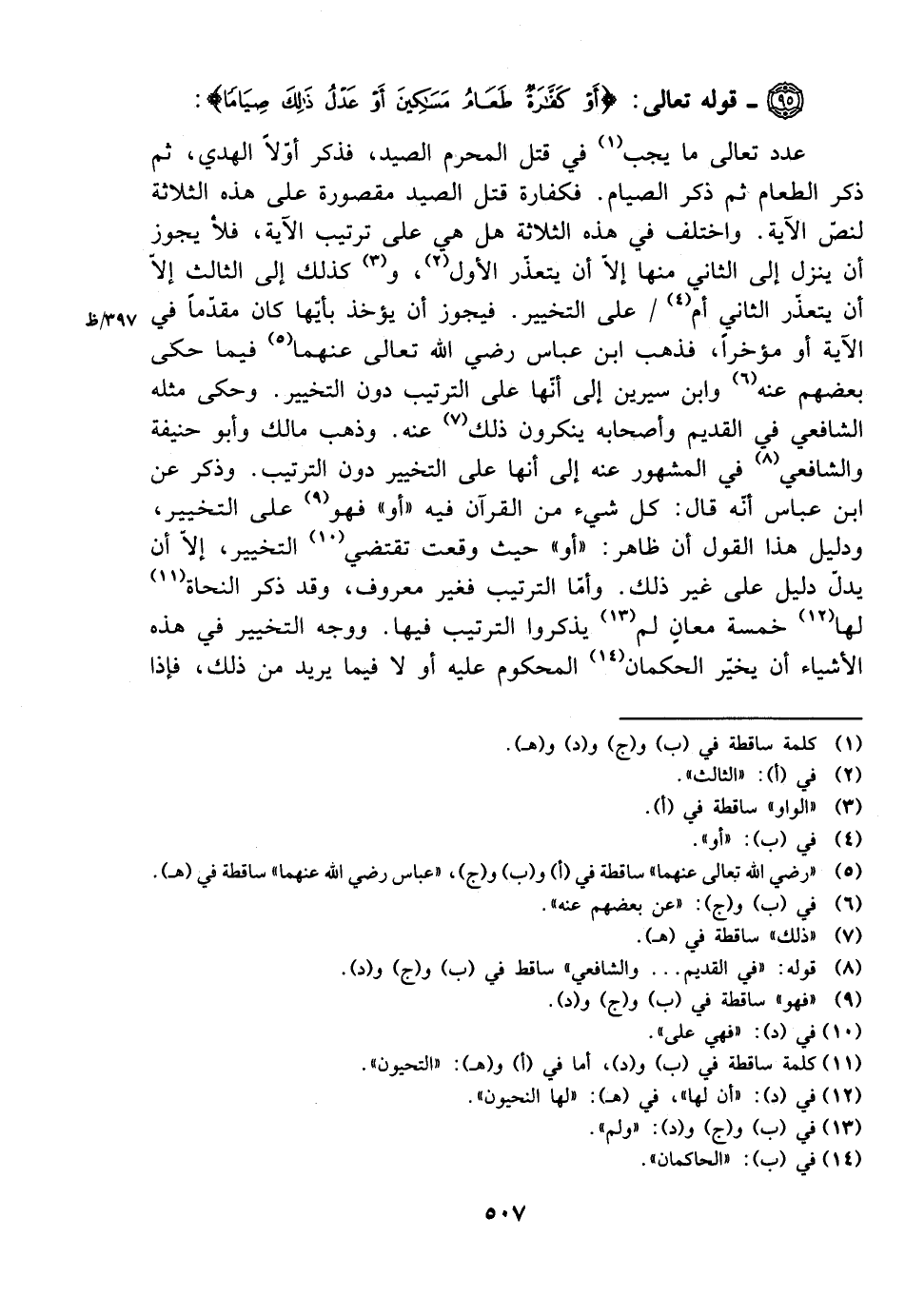 عدد تعالى ما يجب في قتل المحرم الصيد، فذكر أولًا الهدي، ثم ذكر الطعام. فكفارة قتل الصيد مقصورة على هذه الثلاثة لنص الآية. واختلف في هذه الثلاثة هل هي على ترتيب الآية، فلا يجوز أن ينزل إلى الثاني منها إلا أن يتعذر الأول، وكذلك إلى الثالث إلا أن يتعذر الثاني أم على التخيير. فيجوز أن يؤخذ بأيها كان مقدمًا في الآية أو مؤخرًا، فذهب ابن عباس رضي الله تعالى عنهما فيما حكى بضعهم عنه واي سيرين إلى أنها على الترتيب دون التخيير. حكى مثله الشافعي في القديم وأصحابه ينكرون ذلك عنه. وذهب أبو حنيفة والشافعي في المشهور عنه إلى أنها على التخيير دون الترتيب. وذكر عن ابن عباس أنه قال: كل شيء من القرآن فيه ((أو)) فهو على التخيير، ودليل هذا القول أن ظاهر: ((أو)) حيث وقعت تقتضي التخيير، إلا أن يدل دليل على غير ذلك. وأما الترتيب فغير معروف، وقد ذكر النحاة لها خمسة معان لم يذكروا الترتيب فيها. ووجه التخيير في هذه الأشياء أن يخير الحكمان المحكوم عليه أو لا فيما يريد من ذلك، فإذا