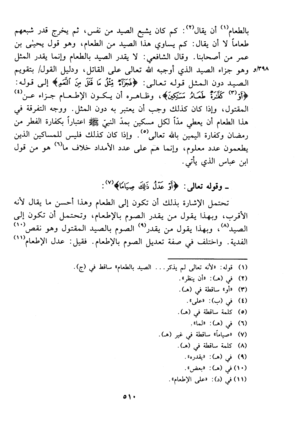 بالطعام أن يقال: كم كان يشبع الصيد من نفس، ثم يخرج قدر شبعهم طعامًا. لا أن يقال: كم يساوي هذا الصيد من الطعام، وهو قول يحيى بن عمر من أصحابنا. وقال الشافعي: لا يقدر الصيد بالطعام، وإنما يقدر بالمثل وهو جزاء الصيد الذي أوجبه الله تعالى على القاتل، ودليل القول بتقويم الصيد دون المثل قوله تعالى: {فجزاء مثل ما قتل من النعم} إلى قوله: {أو كفارة طعام مساكين}، وظاهره أن يكون الإطعام جزاء عن المقتول، وإذا كان كذلك وجب أن يعتبر به دون المثل. ووجه التفرقة في هذا الطعام أن يعطي مدًا لكل مسكين بمد النبي صلى الله عليه وسلم اعتبارًا بكفارة الفطر من رمضان وكفارة اليمين بالله تعالى. وإذا كان كذلك فليس للمساكين الذين يطعمون عدد معلوم، وإنما هم على عدد الأمداد خلاف ما هو من قول ابن عباس الذي يأتي.