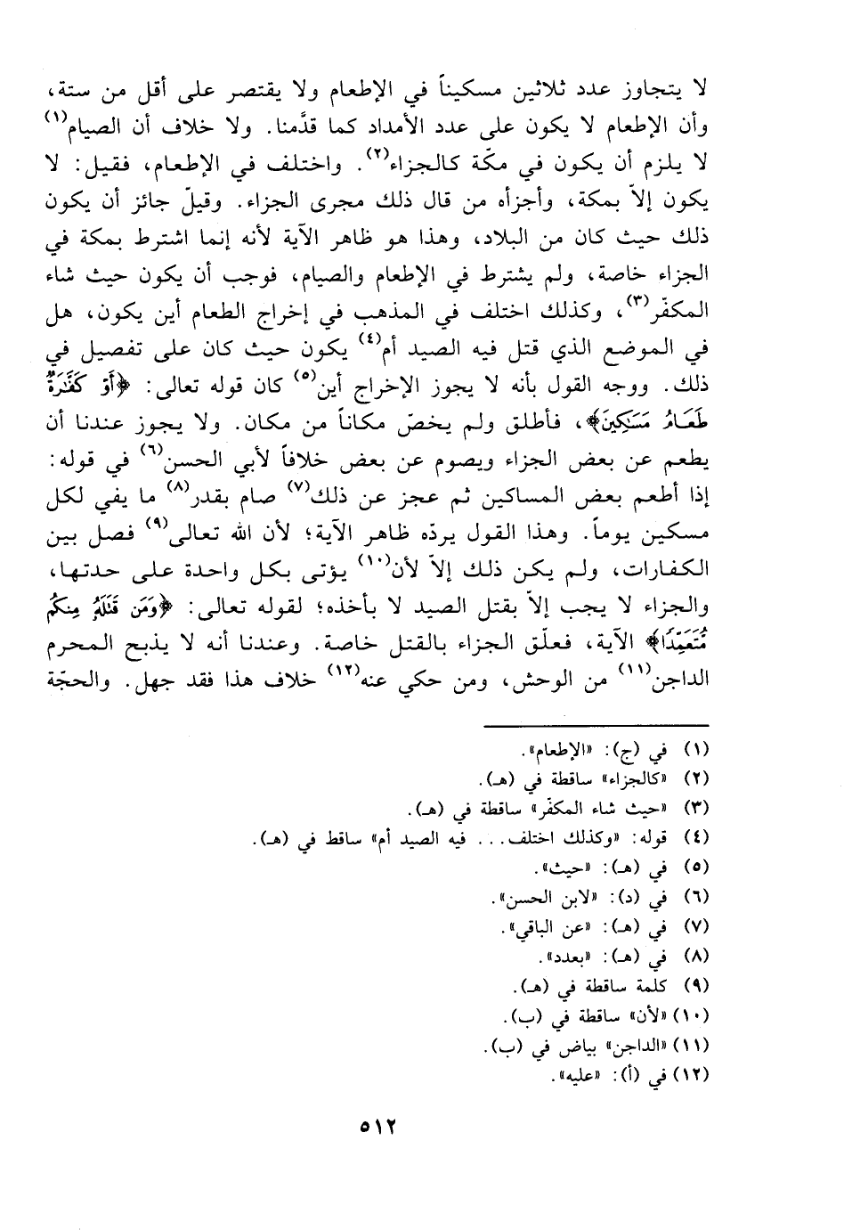 لا يتجاوز عدد ثلاثين مسكينًا في الإطعام ولا يقتصر على أقل من ستة، وأن الإطعام لا يكون على عدد الأمداد كما قدمنا. ولا خلاف أن الصيام لا يلزم أن يكون في مكة كالجزاء. واختلف في الإطعام، فقيل: لا يكون إلا بمكة، وأجزأه من قال ذلك مجرى الجزاء. وقيل: جائز أن يكون ذلك حيث كان من البلاد، وهذا هو ظاهر الآية لأنه إنما اشترط بمكة في الجزاء خاصة، ولم يشترط في الإطعام والصيام، فوجب أن يكون حيث شاء المكفر، وكذلك اختلف في المذهب في إخراج الطعام أين يكون، هل في الموضع الذي قتل فيه الصيد أم يكون حيث كان على تفضيل في ذلك. ووجه القول بأنه لا يجوز الإخراج أين كان قوله تعالى: {أو كفارة طعام مساكين}، فأطلق ولم يخص مكانًا من مكان. ولا يجوز عندنا أن يطعم عن بعض الجزاء ويصوم عن بعض خلافًا لأبي الحسن في قوله: إذا أطعم بعض المساكين ثم عجز عن ذلك صام بقدر ما يفي لكل مسكين يومًا. وهذا القول يرده ظاهر الآية؛ لأن الله تعالى فصل بين الكفارات، ولم يكن ذلك إلا لأن يؤتى بكل واحدة على حدتها، والجزاء لا يجب إلا بقتل الصيد لا بأخذه؛ لقوله تعالى: {ومن قتله منكم متعمدًا} الآية، فعلق الجزاء بالقتل خاصة. وعندنا أنه لا يذبح المحرم الداجن من الوحش، ومن حكي عنه خلاف هذا فقد جهل. والحجة
