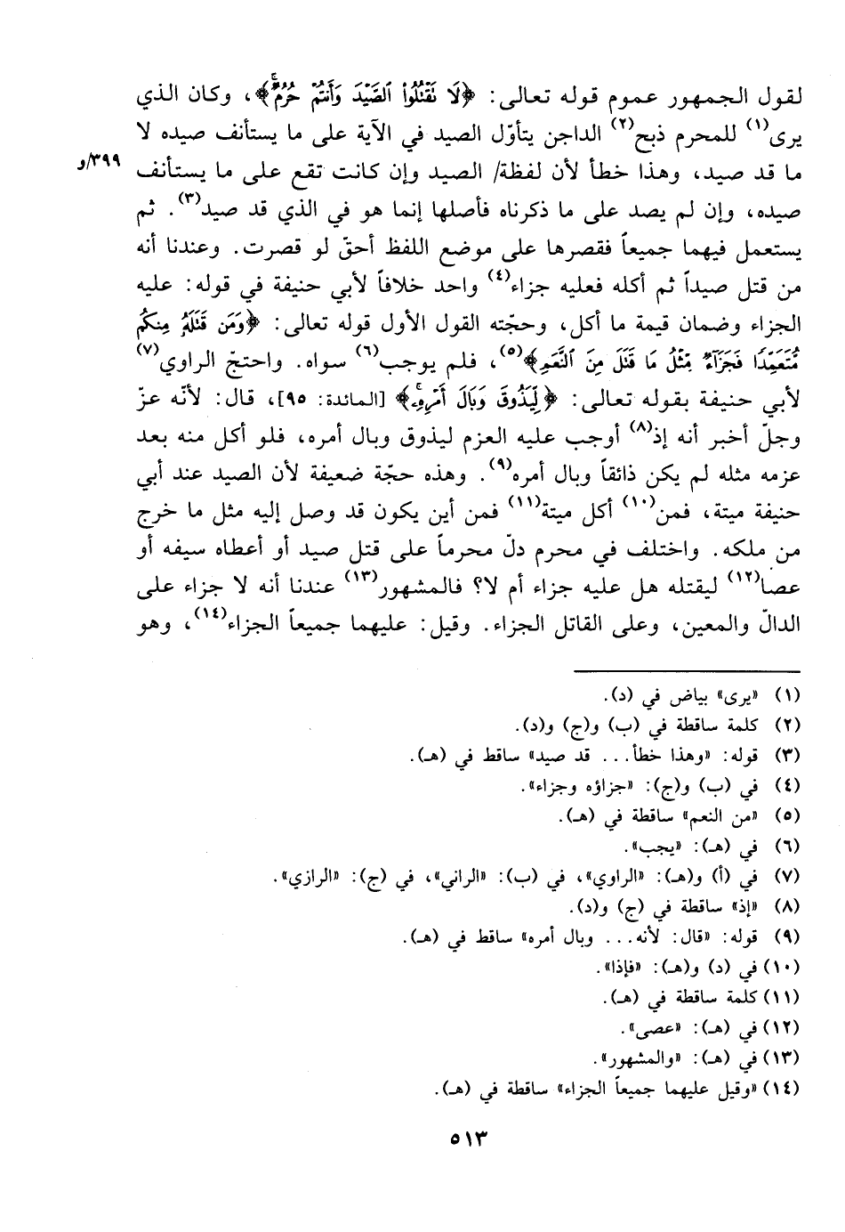 لقول الجمهور عموم قوله تعالى: {لا تقتلوا الصيد وأنتم حرم}، وكان الذي يرى للمحرم ذبح الداجن يتأول الصيد في الآية على ما يستأنف صيده لا ما قد صيد، وهذا خطأ لأن لفظة الصيد وإن كانت تقع على ما يستأنف صيده، وإن لم يصد على ما ذكرناه فأصلها إنما هو في الذي قد صيد. ثم يستعمل فيهما جميعًا فقصرها على موضع اللفظ أحق لو قصرت. وعندنا أنه من قتل صيدًا ثم أكله فعليه جزاء واحد خلافًا لأبي حنيفة في قوله: عليه الجزاء وضمان قيمة ما أكل، وحجته القول الأول قوله تعالى: {ومن قتله منكم متعمدًا فجزاء مثل ما قتل من النعم}، فلم يوجب سواه. واحتج الراوي لأبي حنيفة بقوله تعالى: {ليذوق وبال أمره} [المائدة: 95]، قال: لأنه عز وجل أخبر أنه إذ أوجب عليه العزم ليذوق وبال أمره، فلو أكل منه بعد عزمه مثله لم يكن ذائقًا وبال أمره. وهذه حجة ضعيفة لأن الصيد عند أبي حنيفة ميتة، فمن أكل ميتة فمن أين يكون قد وصل إليه مثل ما خرج من ملكه. واختلف في محرم دل محرمًا على قتل صيد أو أعطاه سيفه أو عصا ليقتله هل عليه جزاء أم لا؟ فالمشهور عندنا أنه لا جزاء على الدال والمعين، وعلى القاتل الجزاء. وقيل: عليهما جميعًا الجزاء، وهو