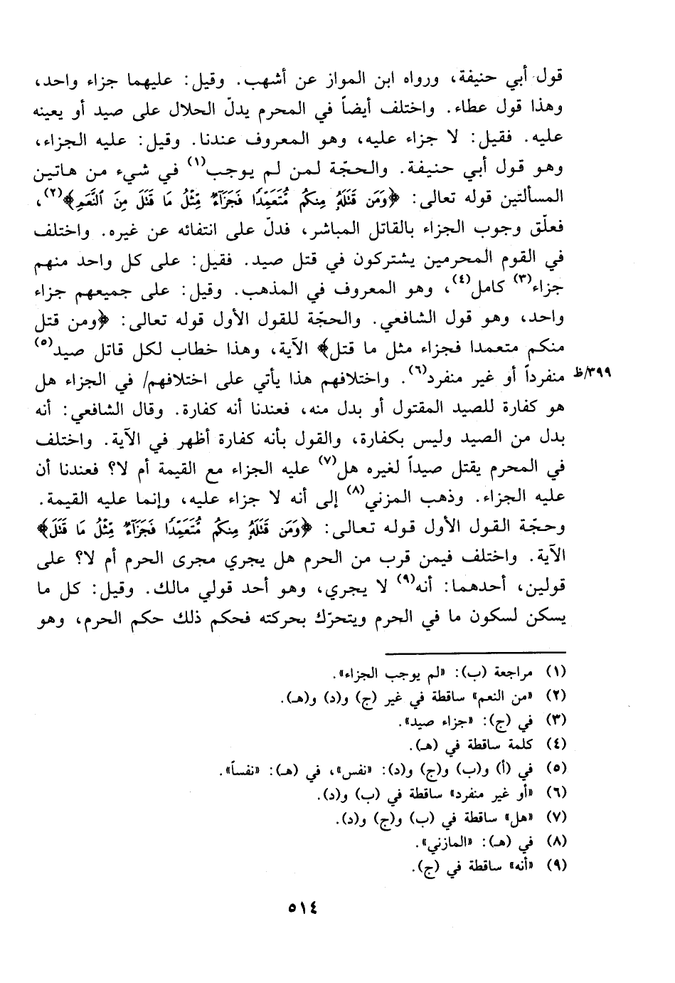 قول أبي حنيفة، ورواه ابن المواز عن أشهب. وقيل: عليهما جزاء واحد، وهذا قول عطاء. واختلف أيضًا في المحرم يدل الحلال على صيد أو يعينه عليه. فقيل: لا جزاء عليه، وهو المعروف عندنا. وقيل: عليه الجزاء، وهو قول أبي حنيفة. والحجة لمن لم يوجب في شيء من هاتين المسألتين قوله تعالى: {ومن قتله منكم متعمدًا فجزاء مثل ما قتل من النعم}، فعلق وجوب الجزاء بالقاتل المباشر، فدل على انتفائه عن غيره. واختلف في القوم المحرمين يشتركون في قتل صيد. فقيل: على جميعهم جزاء واحد، وهو قول الشافعي. ولحجة للقول الأول قوله تعالى: {ومن قتله منكم متعمدًا فجزاء مثل ما قتل} الآية، وهذا خطاب لكل قاتل صيد منفردًا أو غير منفرد. واختلافهم هذا يأتي على اختلافهم في الجزاء هل هو كفارة للصيد المقتول أو بدل منه، فعندنا أنه كفارة. وقال الشافعي: أنه بدل من الصيد وليس بكفارة، والقول بأنه كفارة أظهر في الآية. واختلف في المحرم يقتل صيدًا لغيره هل عليه الجزاء مع القيمة أم لا؟ فعندنا أن عليه الجزاء. وذهب المزني إلى أنه لا جزاء عليه، وإنما عليه القيمة. وحجة القول الأول قوله تعالى: {ومن قتله منكم متعمدًا فجزاء مثل ما قتل} الآية. واختلف فيمن قرب من الحرم هل يجري مجرى الحرم أم لا؟ على قولين، أحدهما: أنه لا يجري، وهو أحد قولي مالك. وقيل: كل ما يسكن لسكون ما في الحرم ويتحرك بحركته فحكم ذلك حكم الحرم، وهو