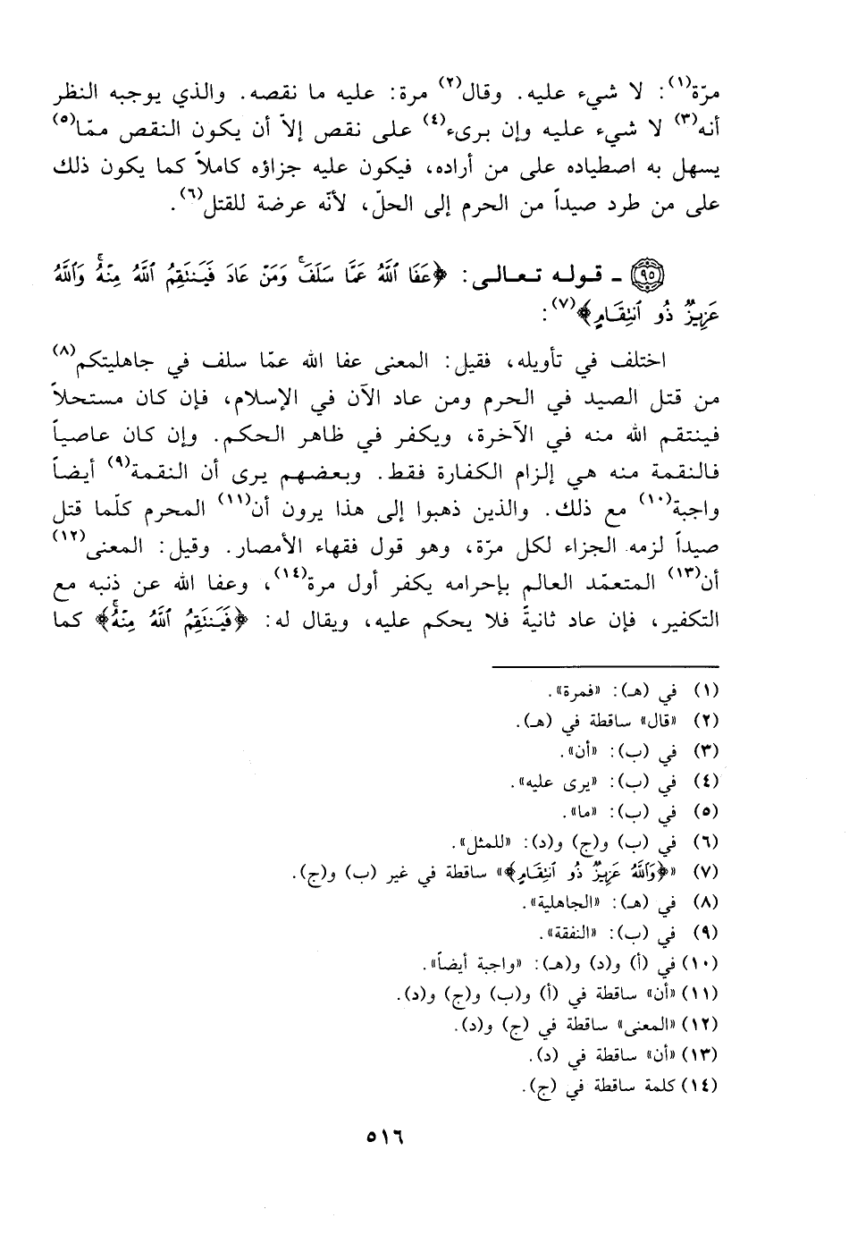 اختلف في تأويله، فقيل: المعنى عفا الله عما سلف في جاهليتكم من قتل الصيد في الحرم ومن عاد الآن في الإسلام، فإن كان مستحلًا فينتقم الله منه في الآخرة، ويكفر في ظاهر الحكم. وإن كان عاصيًا فالنقمة منه هي إلزام الكفارة فقط. وبعصهم يرى أن النقمة أيضًا واجبة مع ذلك. والذين ذهبوا إلى هذا يرون أن المحرم كلما قتل صيدًا لزمه الجزاء لكل مرة، وهو قول فقهاء الأمصار. وقيل: المعنى أن المتعمد العالم بإحرامه يكفر أول مرة، وعفا الله عن ذنبه مع التكفير، فإن عاد الثانية فلا يحكم عليه، ويقال له: {فينتقم الله منه} كما
