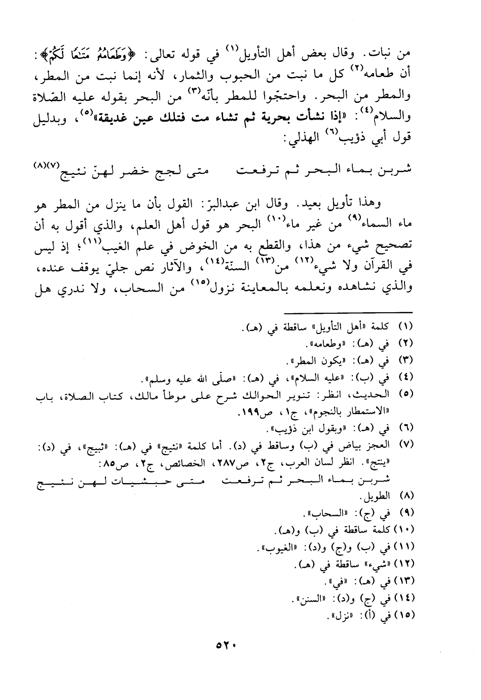 وهذا تأويل بعيد. وقال ابن عبد البر: القول بأن ما ينزل من المطر هو ماء السماء من غير ماء البحر هو قول أهل العلم، والذي أقول به أن تصحيح شيء من هذا والقطع به من الخوض في علم الغيب؛ إذ ليس في القرآن ولا شيء من السنة، والآثار نص جلي يوقف عنده، والذي نشاهده ونعلمه بالمعاينة نزول من السحاب، ولا ندري هل