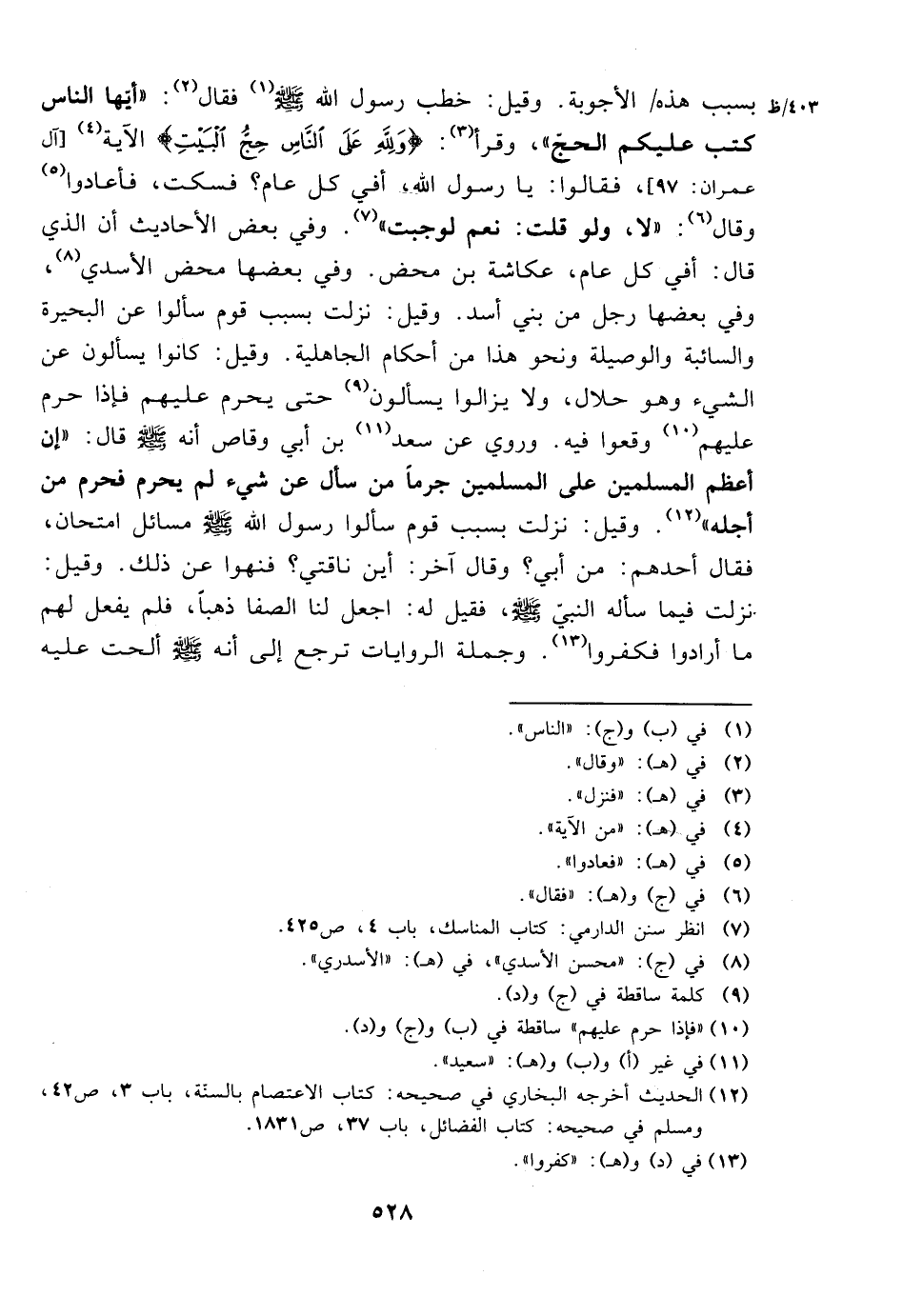 بسبب هذه الأجوبة. وقيل: خطب رسول الله صلى الله عليه وسلم فقال: ((أيها الناس كتب عليكم الحج))، وقرأ: {ولله على الناس حج البيت} الآية [آل عمران: 97]، فقالوا: يا رسول الله، أفي كل عام؟ فسكت، فأعادوا وقال: ((لا، ولو قلت نعم لوجبت)). وفي بعض الأحاديث أن الذي قال: أفي كل عام، عكاشة بن محصن. وفي بعضها محض الأسدي، وفي بعضها رجل من بني أسد. وقيل: نزلت بسبب قوم سألوا عن البحيرة والسائبة والوصيلة ونحو هذا من أحكام الجاهلية. وقيل: كانوا يسألون عن الشيء وهو حلال، ولا يزالوا يسألون حتى يحرم عليهم فإذا حرم عليهم وقعوا فيه. وروي عن سعد بن أبي وقاص أنه صلى الله عليه وسلم قال: ((إن أعظم المسلمين على المسلمين جرمًا من سأل عن شيء لم يحرم فحرم من أجله)). وقيل: نزلت بسبب قوم سألوا رسول الله صلى الله عليه وسلم مسائل امتحان، فقال أحدهم: من أبي؟ وقال آخر: أين ناقتي؟ فنهوا عن ذلك. وقيل: نزلت فيما سأله النبي صلى الله عليه وسلم، فقيل له: لجعل لنا الصفا ذهبًا، فلم يفعل لهم ما أرادوا فكفروا. وجملة الروايات ترجع إلى أنه صلى الله عليه وسلم ألحت عليه