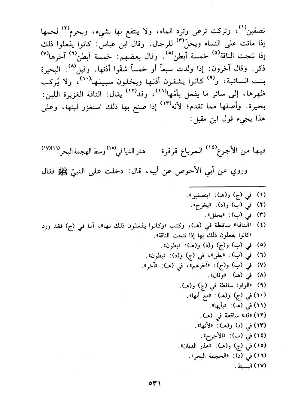 نصفين، وتركت ترعى وترد الماء، ولا ينتفع بها بشيء، ويحرم لحمها إذا ماتت على النساء ويحل للرجال. وقال ابن عباس: كانوا يفعلون ذلك إذا تنجت الناقة خمسة أبطن. وقال بعضهم: خمسة أبطن آخرها ذكر. وقال آخرون: إذا ولدت سبعًا أو خمسًا شقوا أذنها. وقيل: البحيرة بنت السائبة، وكانوا يشقون أذنها ويخلون سبيلها، ولا يركب ظهرها، إلى سائر ما يفعل بأمها، وقد يقال: الناقة الغزيرة اللبن: بحيرة. وأصلها مما تقدم؛ لأنه إذا صنع بها ذلك استغزر لبنها، وعلى هذا يجيء قول ابن مقبل: