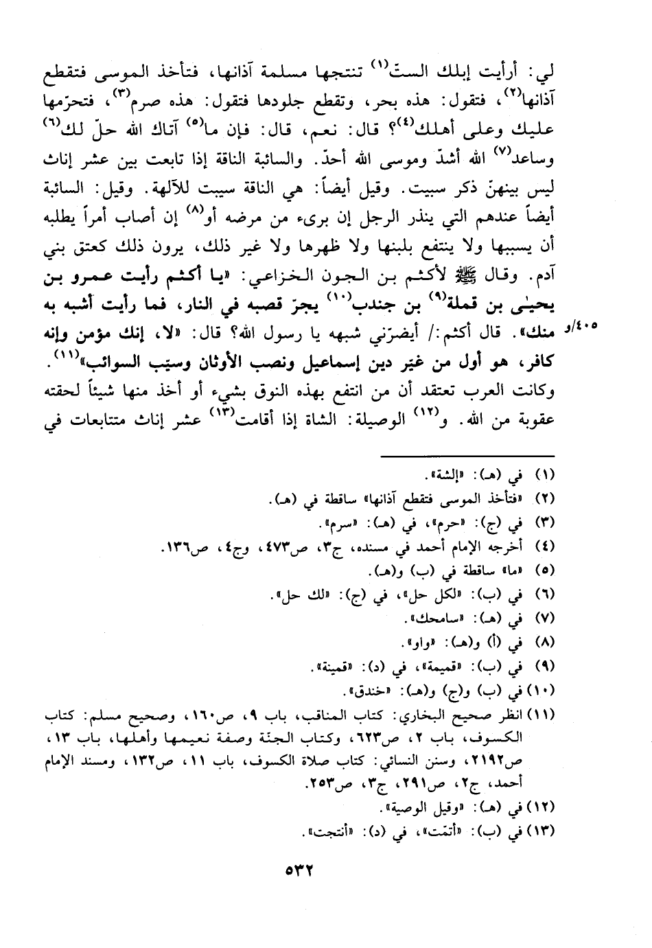 لي: أرأيت إبلك الست تنتجها مسلمة آذانها، فتأخذ الموسى فتقطع آذانها، فتقول: هذه بحر، وتقطع جلودها فتقول: هذه صرم، فتحرمها عليك وعلى أهلك؟ قال: نعم، قال: فإن ما آتاك الله حل لك وساعد الله أشد وموسى الله أحد. والسائبة الناقة إذا تابعت بين عشر إناث ليس بينهن ذكر سيبت. وقيل أيضًا: هي الناقة سيبت للآلهة. وقيل: السائبة أيضًا عندهم التي ينذر الرجل إن برئ من مرضه أو إن أصاب أمرًا يطلبه أن يسببها ولا ينتفع بلبنها ولا ظهرها ولا غير ذلك، يرون ذلك كعتق بني آدم. وقال صلى الله عليه وسلم لأكثم بن الجون الخزاعي: ((يا أكثم رأيت عمرو ببن يحيى بن قملة بن جندب يجر قصبه في النار، فما رأيت أشبه به منك)). قال أكثم: أيضرني شبهه يا رسول الله؟ قال: ((لا، إنك مؤمن وإنه كافر، هو أول من غير دين إسماعيل ونصب الأوثان وسيب السوائب)). وكانت العرب تعتقد أن من انتفع بهذه النوق بشيء أو أخذ منها شيئًا لحقته عقوبة من الله. والوصيلة: الشاة إذا أقامت عشر إناث متتابعات في