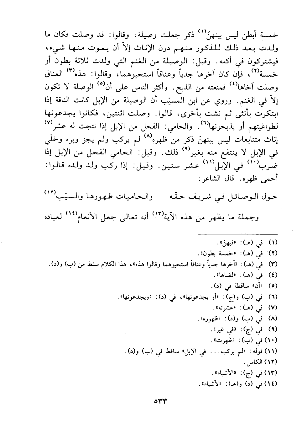 خمسة أبطن ليس بينهن ذكر جعلت وصيلة، قالوا: قد وصلت فكان ما بعد ذلك للذكور منهم دون الإناث إلا أن يموت منها شيء، فيشتركون في أكله. وقيل: الوصيلة من الغنم التي ولدت ثلاثة بكون أو خمسة، فإن كان آخرها جديًا وعناقًا استحيوهما، وقالوا: هذه العناق وصلت أخاها فمنعته من الذبح. وأكثر الناس على أن الوصلة لا تكون إلا في الغنم. وروي عن ابن المسيب أن الوصيلة من الإبل كانت الناقة إذا ابتكرت بأنثى ثم نشت بأخرى، قالوا: وصلت اثنتين، فكانوا يجدعونها لطواغيتهم أو يذبحونها. والحامي: الفحل من الإبل إذا نتجت له عشر إناث متتابعات ليس بينهن ذكر من ظهره لم ولم يجز وبره وخلي في الإبل لا ينتفع منه بغير ذلك. وقيل: الحامي الفحل من الإبل إذا ضرب في الإبل عشر سنين. وقيل: إذا ركب ولد ولده قالوا: أحمى ظهره. قال الشاعر: