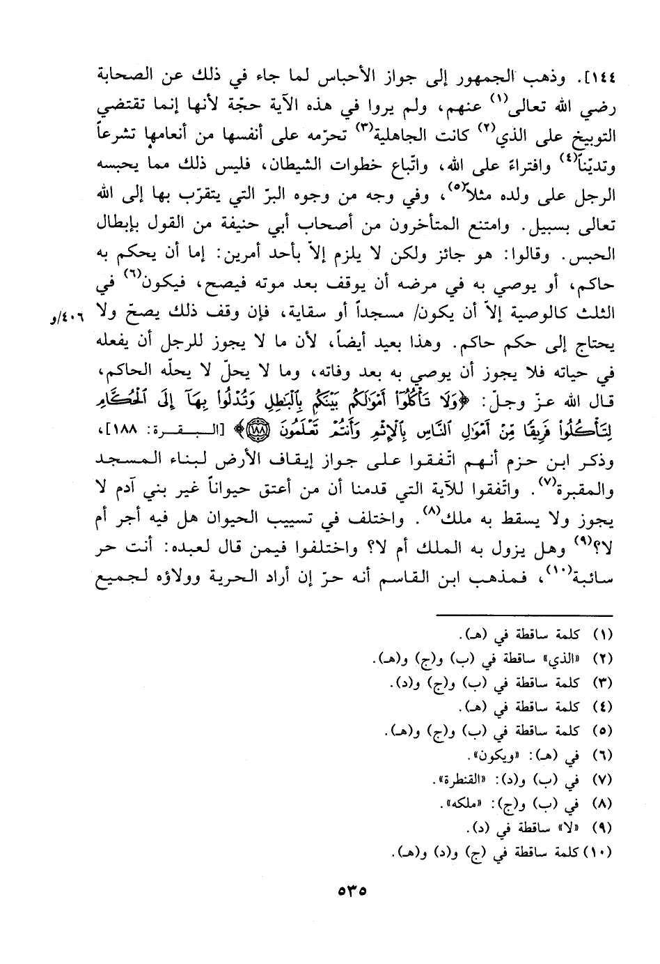 144]. وذهب الجمهور إلى جواز الأحباس لما جاء في ذلك عن الصحابة رضي الله تعالى عنهم، ولم يروا في هذه الآية حجة لأنها إنما تقتضي التوبيخ على الذي كانت الجاهلية تحرمه على أنفسها من أنعامها تشرعًا وتدينًا وافتراء على الله، واتباع خطوات الشيطان، فليس ذلك مما يحبسه الرجل على ولده مثلًا، وفي وجه من وجوه البر التي يتقرب بها إلى الله تعالى بسبيل. وامتنع المتأخرون من أصحاب أبي حنيفة من القول بإبطال الحبس. وقالوا: هو جائز ولكن لا يلزم إلا بأحد أمرين: إما أن يحكم به حاكم، أو يوصي به في مرضه أن يوقف بعد موته فيصح، فيكون في الثلث كالوصية إلا أن يكون مسجدًا أو سقاية، فإن وقف ذلك يصح ولا يحتاج إلى حكم حاكم. وهذا بعيد أيضًا، لأن ما لا يجوز للرجل أن يفعله في حياته فلا يجوز أن يوصي به بعد وفاته، وما لا يحل لا يحل الحاكم، قال الله عز وجل: {ولا تأكلوا أموالكم بينكم بالباطل وتدلوا بها إلى الحكام لتأكلوا فريقًا من أموال الناس بالإثم وأنتم تعلمون} [البقرة: 188]، وذكر ابن حزم أنهم اتفقوا على جواز إيقاف الأرض لبناء المسجد والمقبرة. واتفقوا للآية التي قدمنا أن من أعتق حيوانًا غير بني آدم لا يجوز ولا يسقط به ملك. واختلف في تسييب الحيوان هل فيه أجر أم لا؟ وهل يزول به الملك أم لا؟ واختلفوا فيمن قال لعبده: أنت حر سائبة، فمذهب ابن القاسم أنه حر إن أراد الحرية وولاؤه لجميع