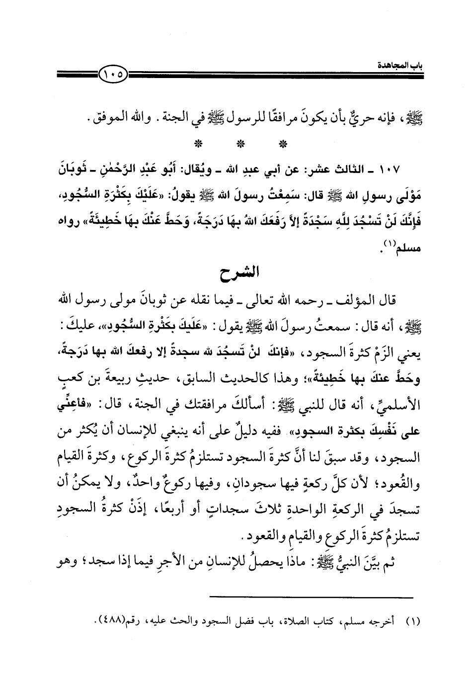107 ـ الثالث عشر: عن أبي عبد الله ـ ويقال: أبو عبد الرحمن ـ ثوبان مولى رسول الله صلى الله عليه وسلم قال: سمعت رسول الله صلى الله عليه وسلم يقول: (عليك بكثرة السجود، فإنك لن تسجد لله سجدة إلا رفعك الله بها درجة، وحط عنك بها خطيئة) . رواه مسلم.