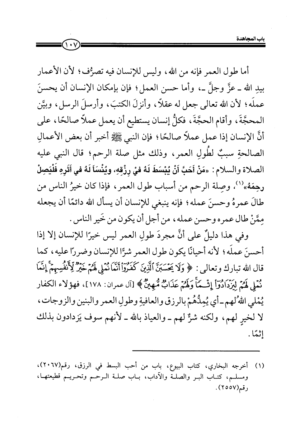وفي هذا دليل على أن مجرد طول العمر ليس خيراً للإنسان إلا إذا أحسن عمله؛ لأنه أحياناً يكون طول العمر شراً للإنسان وضرراً عليه، كما قال الله تبارك وتعالى: (وَلا يَحْسَبَنَّ الَّذِينَ كَفَرُوا أَنَّمَا نُمْلِي لَهُمْ خَيْرٌ لِأَنْفُسِهِمْ إِنَّمَا نُمْلِي لَهُمْ لِيَزْدَادُوا إِثْماً وَلَهُمْ عَذَابٌ مُهِينٌ) (آل عمران: 178) ، فهؤلاء الكفار يملى الله لهم ـ أي يمدهم بالرزق والعافية وطول العمر والبنين والزوجات، لا لخير لهم ولكنه شر لهم ـ والعياذ بالله لأنهم سوف يزدادون بذلك إثماً.