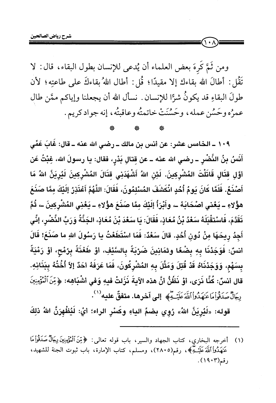 109 ـ الخامس عشر: عن أنس بن مالك ـ رضي الله عنه ـ قال: غاب عمي أنس بن النضر ـ رضي الله عنه ـ عن قتال بدر، فقال: يا رسول الله، غبت عن أول قتال قاتلت المشركين، لئن الله أشهدني قتال المشركين ليرين الله ما أصنع. فلما كان يوم أحد أنكشف المسلمون، فقال: اللهم أعتذر إليك مما صنع هؤلاء ـ يعني أصحابه ـ وأبرأ إليك مما صنع هؤلاء ـ يعني المشركين ـ ثم تقدم، فاستقبله سعد بن معاذ، فقال: يا سعد بن معاذ، الجنة ورب النضر، أني أجد ريحها من دون أحد. قال سعد: فما استطعت يا رسول الله ما صنع! قال أنس: فوجدنا به بضعاً وثمانين ضربة بالسيف، أو طعنة برمح، أو رمية بسهم، ووجدناه قد قتل ومثل به المشركين، فما عرفه أحد إلا أخته ببنانه، قال أنس: كنا نرى، أو نظن أن هذه الآية نزلت فيه وفي أشباهه: (مِنَ الْمُؤْمِنِينَ رِجَالٌ صَدَقُوا مَا عَاهَدُوا اللَّهَ عَلَيْهِ) إلى آخرها. متفق عليه.