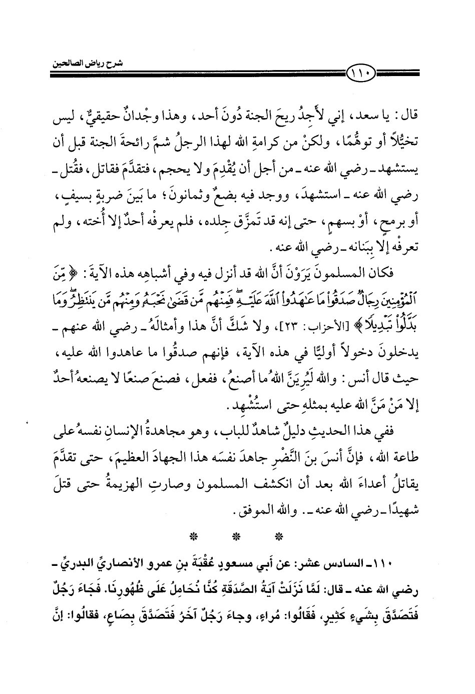 110 ـ السادس عشر: عن أبي مسعود عقبة بن عمرو الأنصاري البدري ـ رضي الله عنه ـ قال: لما نزلت آية الصدقة كنا نحامل على ظهورنا فجاء رجل فتصدق بشيء كثير، فقالوا: مراء وجاء رجل أخر فتصدق بصاع فقالوا: إن