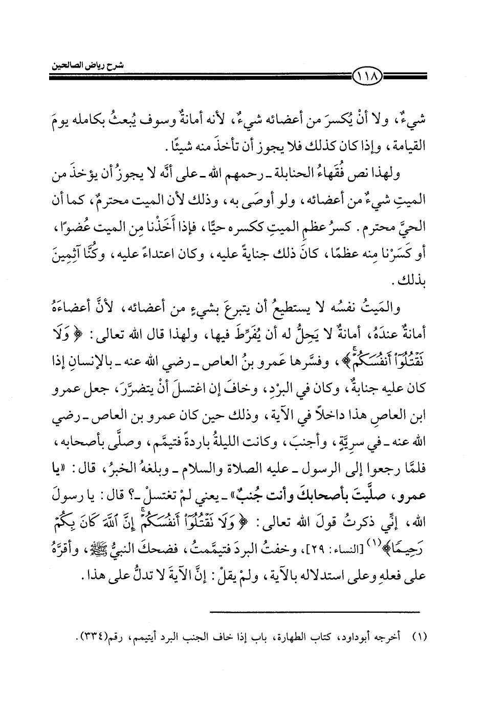 والميت نفسه لا يستطيع أن يتبرع بشيء من أعضائه، لأن أعضاءه أمانة عنده، أمانة لا يحل له أن يفرط فيها، ولهذا قال الله تعالى: (وَلا تَقْتُلُوا أَنْفُسَكُمْ) ، فسرها عمرو بن العاص ـ رضي الله عنه ـ بالإنسان إذا كان عليه جنابة، وكان في البرد، وخاف أن اغتسل أن يتضرر، جعل عمرو بن العاص هذا داخلاً في الآية، وذلك حين كان عمرو بن العاص ـ رضي الله عنه ـ في سرية، وأجنب، وكانت الليلة باردة فتيمم، وصلى بأصحابه، فلما رجعوا إلى الرسول ـ عليه الصلاة والسلام ـ وبلغه الخبر، قال: (يا عمرو، صليت بأصحابك وأنت جنب) ـ يعني لم تغتسل ـ؟ قال: يا رسول الله، إني ذكرت قول الله تعالى: (وَلا تَقْتُلُوا أَنْفُسَكُمْ إِنَّ اللَّهَ كَانَ بِكُمْ رَحِيماً) (النساء: 29) ، وخفت البرد فتيممت، فضحك النبي صلى الله عليه وسلم، وأقره على فعله وعلى استدلاله بالآية، ولم يقل: إن الآية لا تدل على هذا.