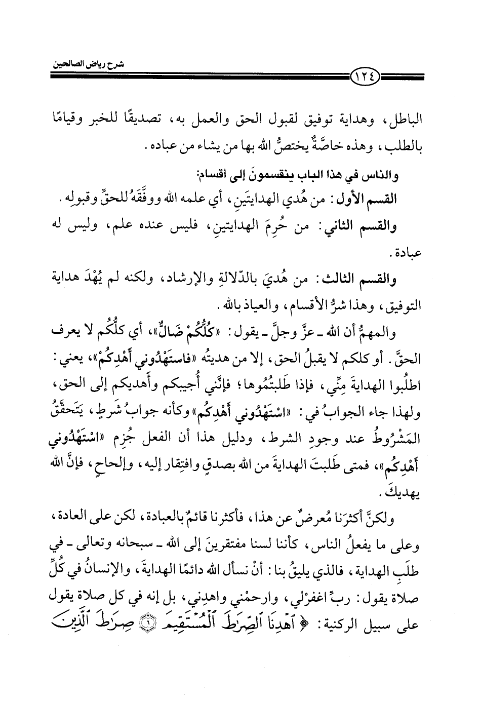 ولكن أكثرنا معرض عن هذا، فأكثرنا قائم بالعبادة، لكن على العادة، وعلى ما يفعل الناس، كأننا لسنا مفتقرين إلى الله ـ سبحانه وتعالى ـ في طلب الهداية، فالذي يليق بنا: أن نسأل الله دائماً الهداية، والإنسان في كل صلاة يقول: رب اغفر لي، ارحمني واهدني بل إنه في كل صلاة: يقول على سبيل الركنية: (اهْدِنَا الصِّرَاطَ الْمُسْتَقِيمَ صِرَاطَ الَّذِينَ
