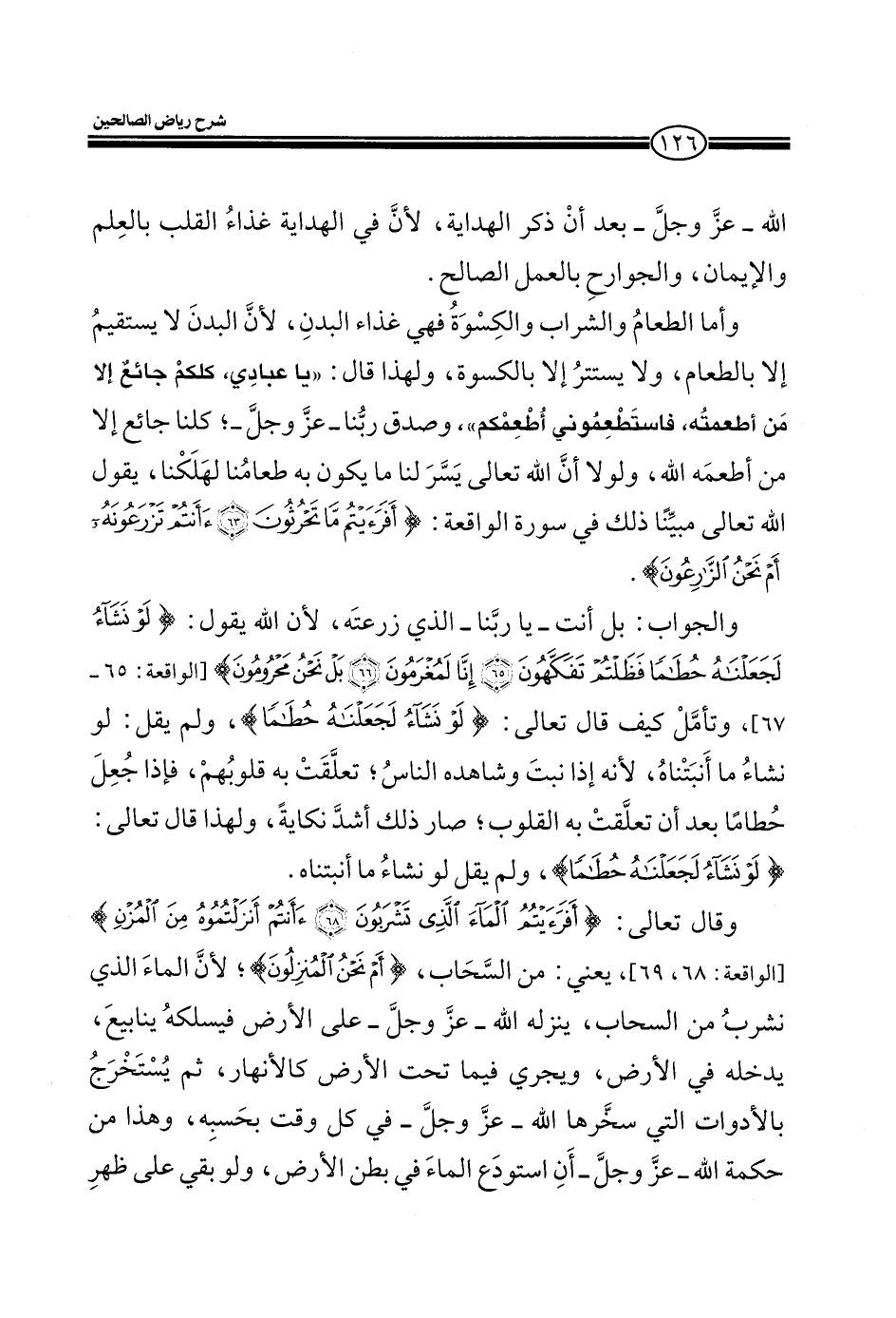 أما الطعام والشراب والكسوة فهي غذاء البدن، لأن البدن لا يستقيم إلا بالطعام، ولا يستتر إلا بالكسوة، ولهذا قال: (يا عبادي، لكم جائع إلا من أطعمته، فاستطعموني أطعمكم) وصدق ربنا ـ عز وجل ـ كلنا جائع إلا من أطعمه الله، ولولا أن الله تعالى يسر لنا ما يكون به طعامنا لهلكنا، يقول الله تعالى مبيناً ذلك في سورة الواقعة: (أَفَرَأَيْتُمْ مَا تَحْرُثُونَ أَأَنْتُمْ تَزْرَعُونَهُ أَمْ نَحْنُ الزَّارِعُونَ) .