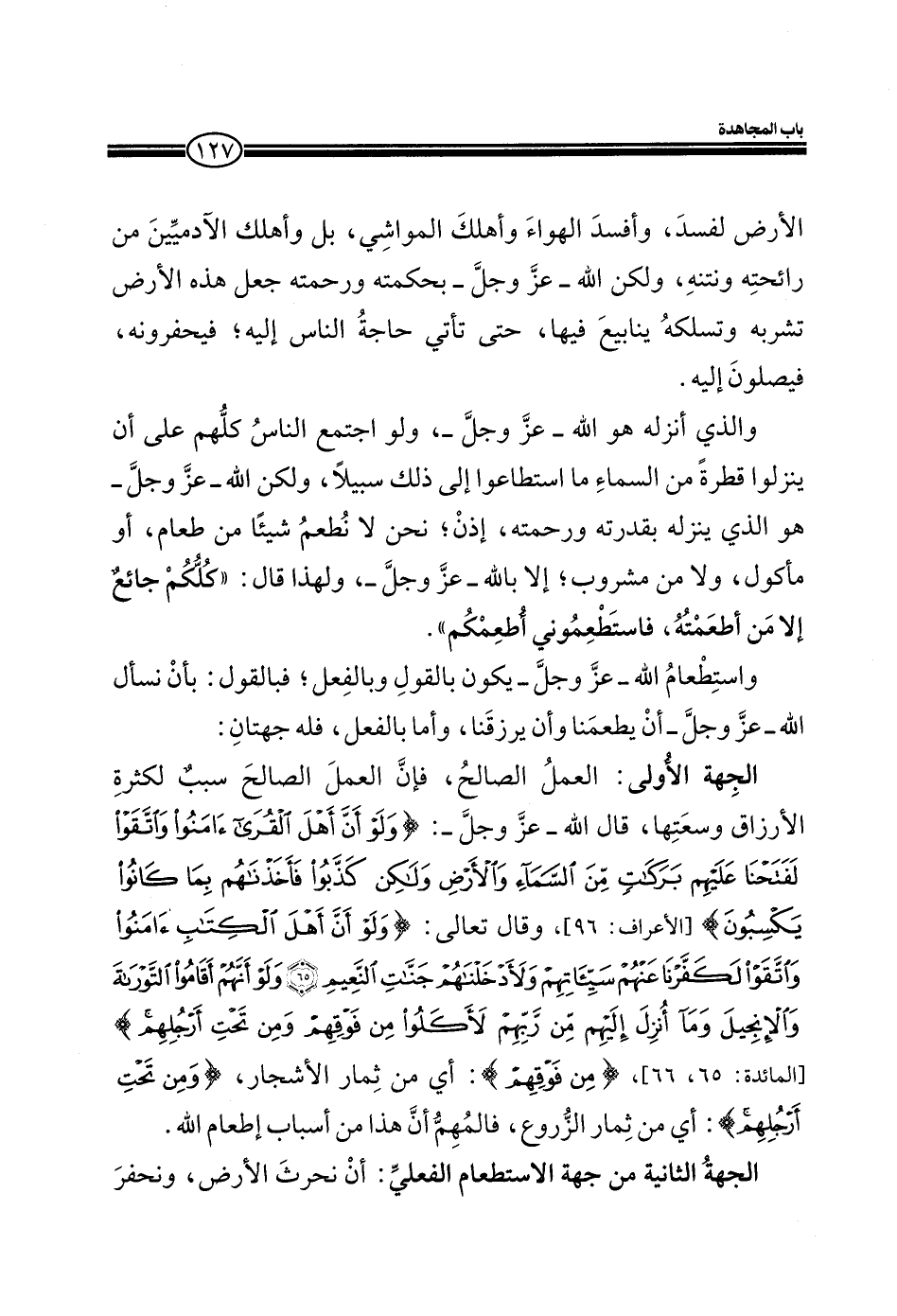 الجهة الأولى: العمل الصالح، فإن العمل الصالح سبب لكثرة الأرزاق وسعتها، قال الله ـ عز وجل ـ: (وَلَوْ أَنَّ أَهْلَ الْقُرَى آمَنُوا وَاتَّقَوْا لَفَتَحْنَا عَلَيْهِمْ بَرَكَاتٍ مِنَ السَّمَاءِ وَالْأَرْضِ وَلَكِنْ كَذَّبُوا فَأَخَذْنَاهُمْ بِمَا كَانُوا يَكْسِبُونَ) (الأعراف: 96) ، وقال تعالى: (وَلَوْ أَنَّ أَهْلَ الْكِتَابِ آمَنُوا وَاتَّقَوْا لَكَفَّرْنَا عَنْهُمْ سَيِّئَاتِهِمْ وَلَأَدْخَلْنَاهُمْ جَنَّاتِ النَّعِيمِ وَلَوْ أَنَّهُمْ أَقَامُوا التَّوْرَاةَ وَالْأِنْجِيلَ وَمَا أُنْزِلَ إِلَيْهِمْ مِنْ رَبِّهِمْ لَأَكَلُوا مِنْ فَوْقِهِمْ وَمِنْ تَحْتِ أَرْجُلِهِمْ) (المائدة: 65، 66) ، (مِنْ فَوْقِهِمْ) : أي من ثمار الأشجار، (وَمِنْ تَحْتِ أَرْجُلِهِمْ) : أي من ثمار الزروع، فالمهم أن هذا من أسباب إطعام الله.
