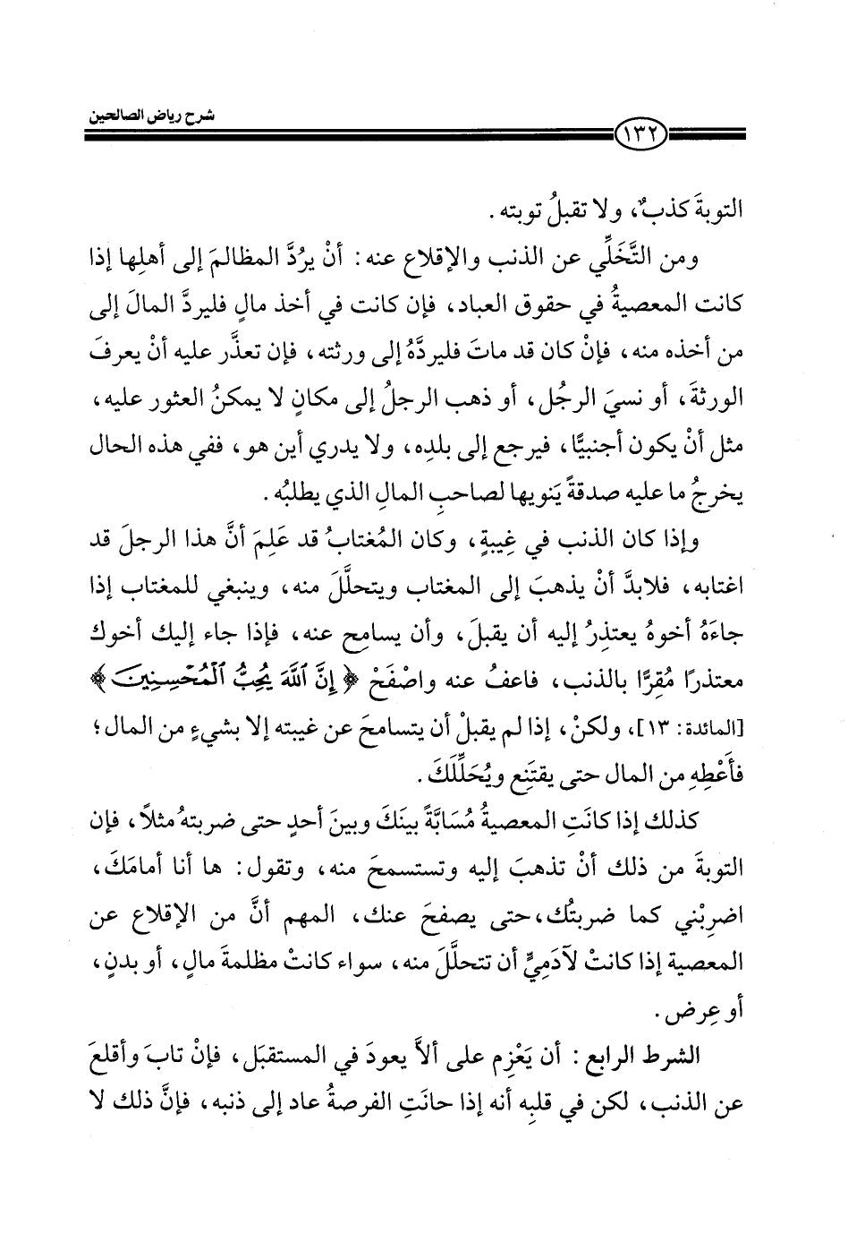 كذلك إذا كانت المعصية مسابة بينك وبين أحد حتى ضربته مثلاً، فإن التوبة من ذلك أن تذهب إليه وتستسمح منه، وتقول: ها أنا أمامك اضربني كما ضربتك، حتى يصفح عنك، المهم أن من الإقلاع عن المعصية إذا كانت لآدمي أن تحلل منه، سواء كانت مظلمة مال، أو بدن، أو عرض.
