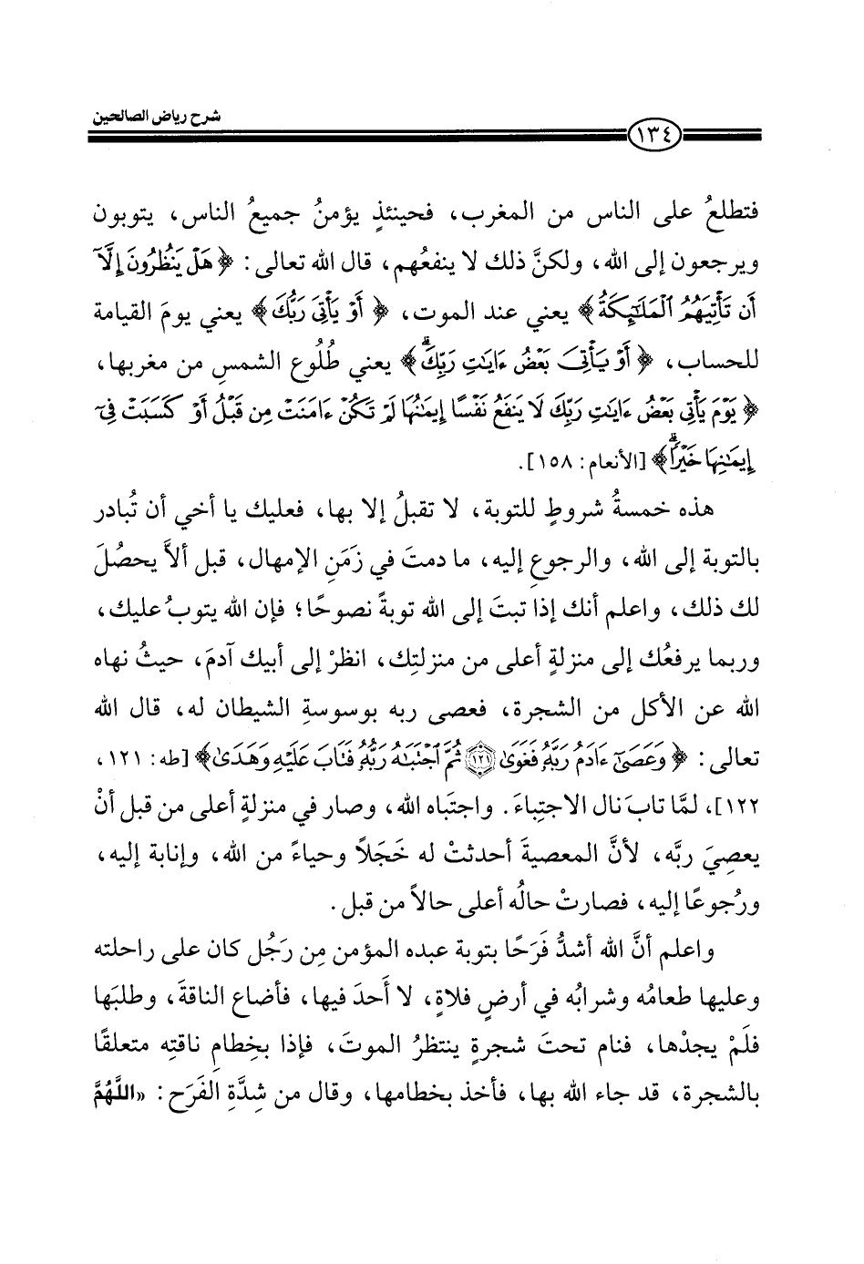 واعلم أن الله اشد فرحاً بتوبة عبده المؤمن من رجل كان على راحلته وعليها طعامه وشرابه في أرض فلاة، لا أحد فيها، فأضاع الناقة، وطلبها فلم يجدها، فنام تحت شجرة ينتظر الموت، فإذا بخطام ناقته متعلقاً بالشجرة، قد جاء الله بها، فأخذ بخطامها، وقال من شدة الفرح: (اللهم