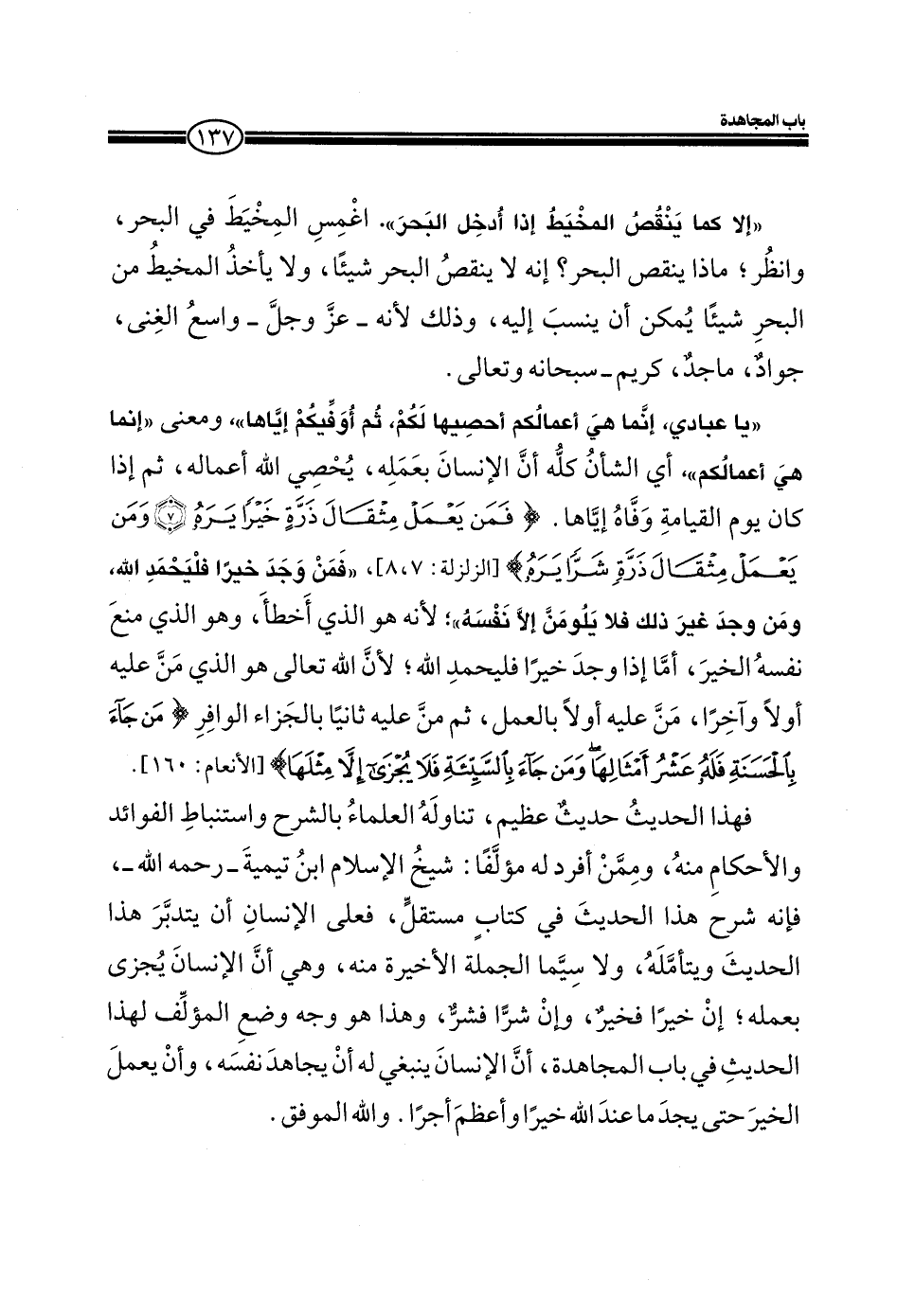 فهذا الحديث حديث عظيم، تناوله العلماء بالشرح واستنباط الفوائد والأحكام منه، وممن أفرد له مؤلفاً: شيخ الإسلام أبن تيمية ـ رحمه الله ـ، فإنه شرح هذا الحديث في كتاب مستقل، فعلى الإنسان أن يتدبر هذا الحديث ويتأمله، ولا سيما الجملة الأخيرة منه، وهي أن الإنسان يجزى بعمله، إن خير فخير، وإن شراً فشر، وهذا هو وجه وضع المؤلف لهذا الحديث في باب المجاهدة، أن الإنسان ينبغي له أن يجاهد نفسه، وأن يعمل الخير حتى يجد ما عند الله خيراً وأعظم أجراً. والله الموفق.