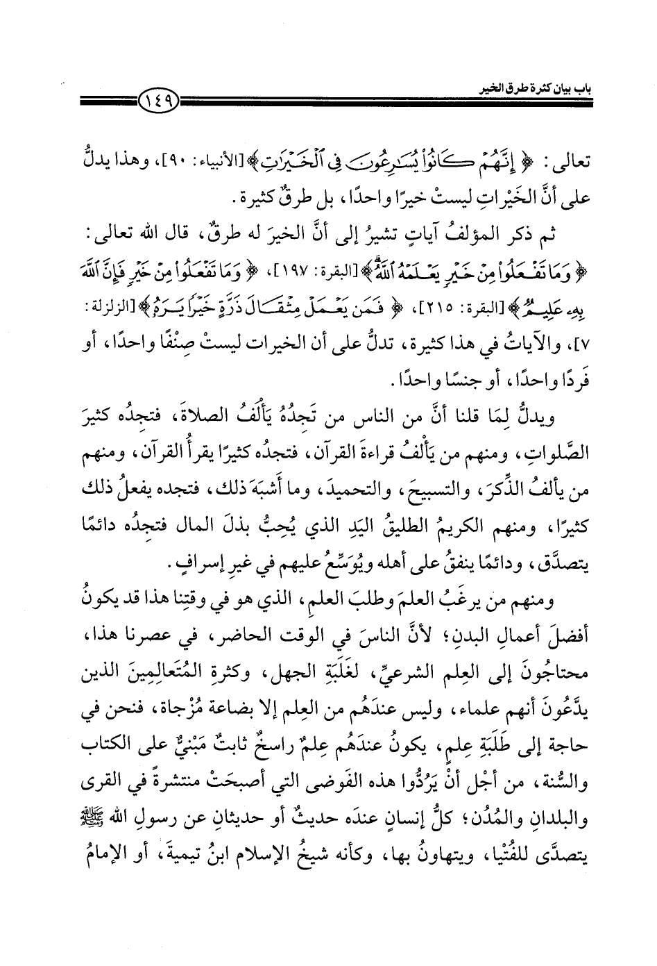 ثم ذكر المؤلف آيات تشير إلى الخير له طرق، قال تعالى: (وَمَا تَفْعَلُوا مِنْ خَيْرٍ يَعْلَمْهُ اللَّهُ) (البقرة: 197) ، (وَمَا تَفْعَلُوا مِنْ خَيْرٍ فَإِنَّ اللَّهَ بِهِ عَلِيم) (البقرة: 215) ، (فَمَنْ يَعْمَلْ مِثْقَالَ ذَرَّةٍ خَيْراً يَرَهُ) (الزلزلة: 7) ، والآيات في هذا كثيرة، تدل على أن الخيرات ليست صنفاً واحداً، أو فرداً واحداً، أو جنساً واحداً.